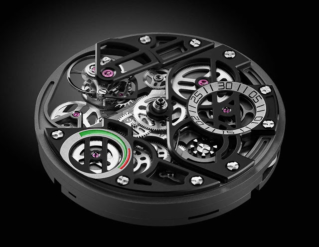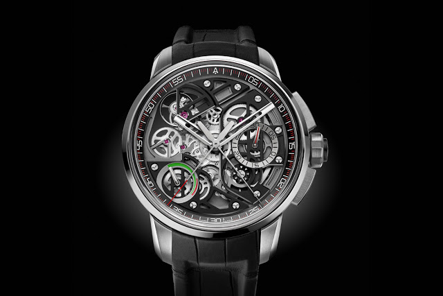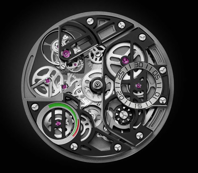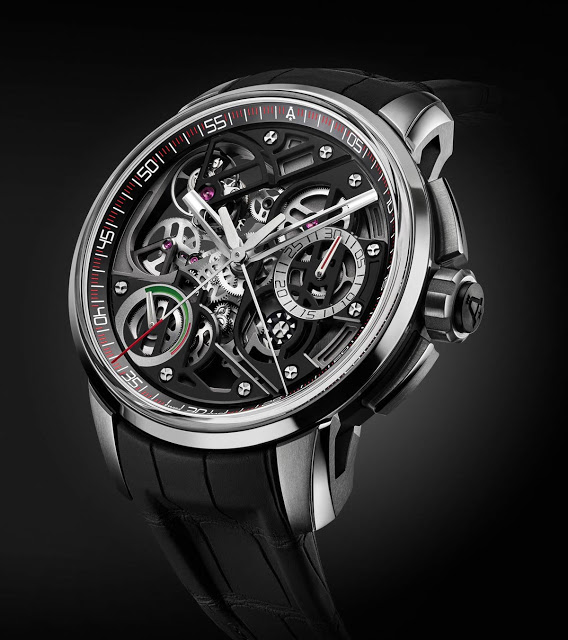Круглый корпус новинки, изготовленный из титана, диаметром 47,0 мм, толщиной 15,0 мм, водонепроницаемый до 30 метров. На торце заводной головки, расположенной на 3 часах, выгравирован логотип бренда Angelus. Продолговатые пушеры хронографа размещены на 2 и 4 часах. Сапфировое стекло установлено на передней стороне часового корпуса (с двусторонним антибликовым покрытием) и на его завинчивающейся задней крышке. Циферблат, как таковой, отсутствует, благодаря чему детали калибра отлично просматриваются. На черный фланец нанесена разметка белого и красного цвета. Часовая и минутная стрелки скелетонизированные. Модель оснащена мануфактурным скелетонизированным швейцарским автоматическим механизмом Angelus А-150, на 38 камнях, с балансовой частотой 28800 полуколебаний в час (4 гц), 45-часовым запасом хода, функциями индикации часов и минут (посредством соответствующих центральных стрелок), с flyback и split-seconds (rattrapante) хронографом (две центральные секундные стрелки и круглый аналоговый 30-минутный счетчик, расположенный на 3 часах), запаса хода (посредством соответствующего аналогового указателя, расположенного на 8 часах), а также с минутным турбийоном, круглая каретка которого (полностью изготовленная из немагнитных материалов) расположена на 10 часах. Интересно отметить, что хронограф на двух колонных колесах; первый из них, контролирующий функцию split-seconds, просматривается на 4 часах, а второе колесо - на задней стороне механизма. Все функции реализованы не на модульной основе, а полностью интегрированы в калибр. Последний отлично отделан и декорирован вручную. Поставляется на ремешке из кожи аллигатора с черной резиновой накладкой и с титановой раскладной застежкой. Лимитированный выпуск 25 пронумерованных экземпляров. Цена модели Angelus U30 Tourbillon Rattrapante составляет 55600 швейцарских франков. Вложение 1319941 Вложение 1319942 Вложение 1319943 Вложение 1319944 Вложение 1319945 Источник: http://www.timeandwatches.com/2016/0...ttrapante.html |