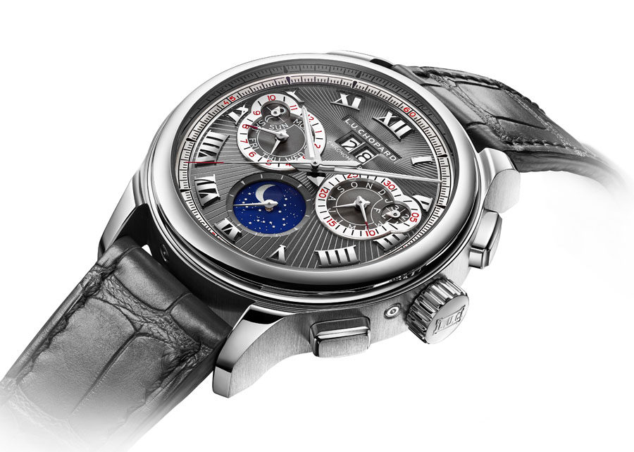 Круглый полированный корпус новинки, изготовленный из 18-каратного белого золота, диаметром 45,0 мм. На торце рифленой заводной головки, расположенной на 3 часах, выгравирован логотип часовой линейки L.U.C. Прямоугольные пушеры хронографа размещены на 2 и 4 часах. Сапфировое стекло установлено на передней стороне часового корпуса и на его задней крышке. Циферблат серого цвета, гильошированный, с накладными римскими цифрами, а также с часовой и минутной стрелками, покрытыми люминесцентным составом белого цвета. Хронографические стрелки с красными наконечниками. Модель оснащена мануфактурным швейцарским механизмом с ручным заводом Chopard L.U.C 03.10-L, с вечным календарем и flyback-хронографом с колонным колесом, функциями индикации часов, минут (посредством соответствующих центральных стрелок), секунд (на соответствующем малом боковом циферблате, расположенном на 6 часах), даты (посредством соответствующего цифрового указателя в сдвоенных прямоугольных апертурах, расположенных на 12 часах), дня недели (посредством соответствующего круглого аналогового указателя, расположенного на 9 часах), месяца (посредством соответствующего круглого аналогового указателя, расположенного на 3 часах), высокосного года (посредством соответствующего круглого аналогового указателя, расположенного между 2 и 3 часами), дня/ночи (посредством соответствующего круглого аналогового указателя, расположенного между 9 и 10 часами), фаз Луны (посредством соответствующего круглого указателя, совмещенного с малым боковым циферблатом, расположенным на 6 часах, а также с хронографом (центральная секундная стрелка, круглый аналоговый 30-минутный счетчик с красной разметкой, расположенный на 3 часах и круглый аналоговый 12-часовый счетчик с красной разметкой, расположенный на 9 часах). Калибр отменно отделан и декорирован, официально сертифицирован COSC (Contrôle Officiel Suisse des Chronomètres) в качестве хронометра, а часы в целом отмечены "женевским клеймом" ("Geneva hallmark").