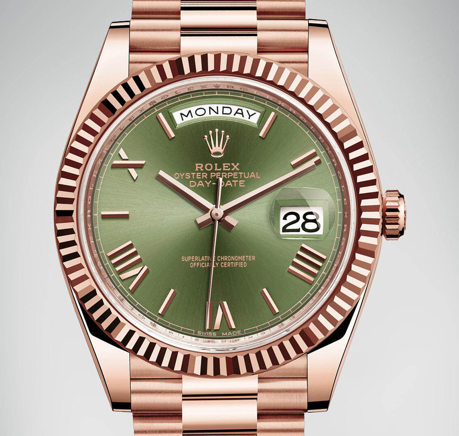 Она имеет круглый полированный корпус, изготовленный из фирменного золотого сплава Everosegold, диаметром 40,0 мм. Фиксированный рифленый безель. На торце рифленой заводной головки, расположенной на 3 часах, выгравировано изображение короны - эмблемы бренда Rolex. Сапфировое стекло со встроенной лупой над указателем даты, защищает зеленый циферблат с лучистой отделкой, накладными золотыми гранеными римскими цифрами, продолговатыми часовыми индексами и стрелками. Накладная золотая корона Rolex расположена на 12 часах. Модель оснащена мануфактурным швейцарским автоматическим механизмом Rolex 3255, с функциями индикации часов, минут, секунд (посредством соответствующих центральных стрелок), даты (посредством соответствующего цифрового указателя в прямоугольной апертуре, расположенной на 3 часах), а также дня недели (посредством соответствующего буквенного указателя в дугообразной апертуре, расположенной между 11 и 13 часами).