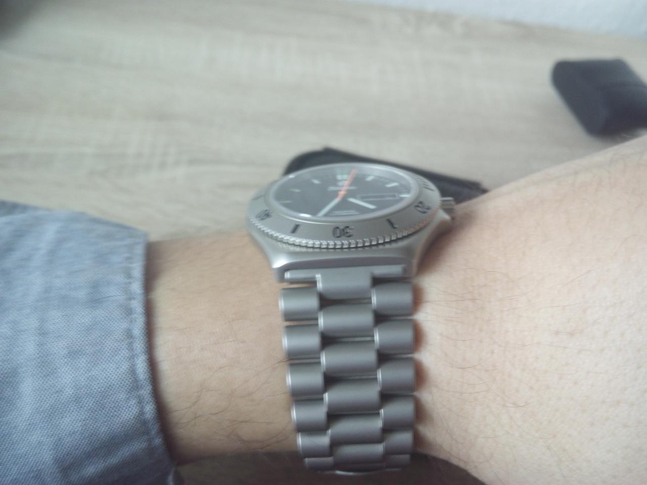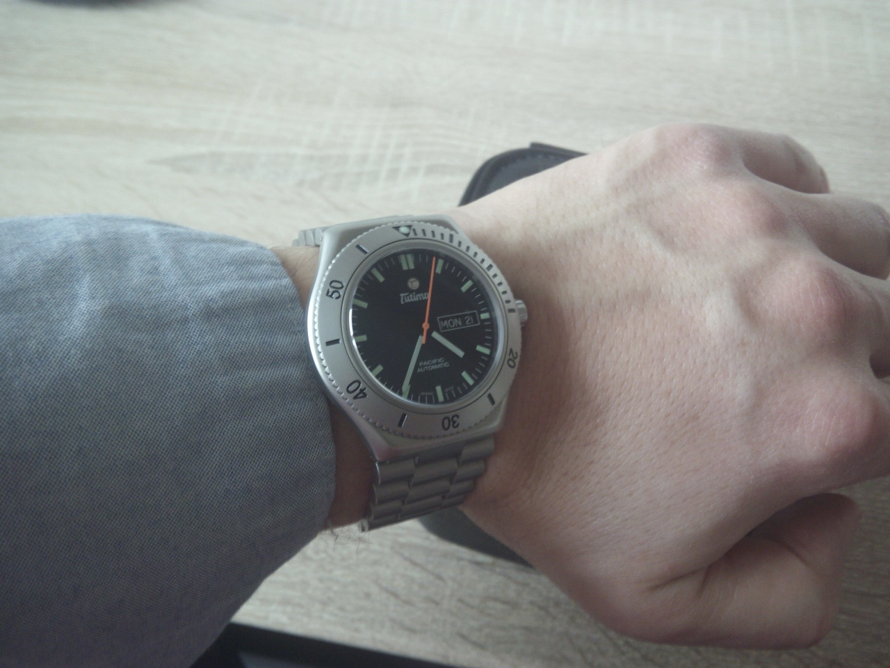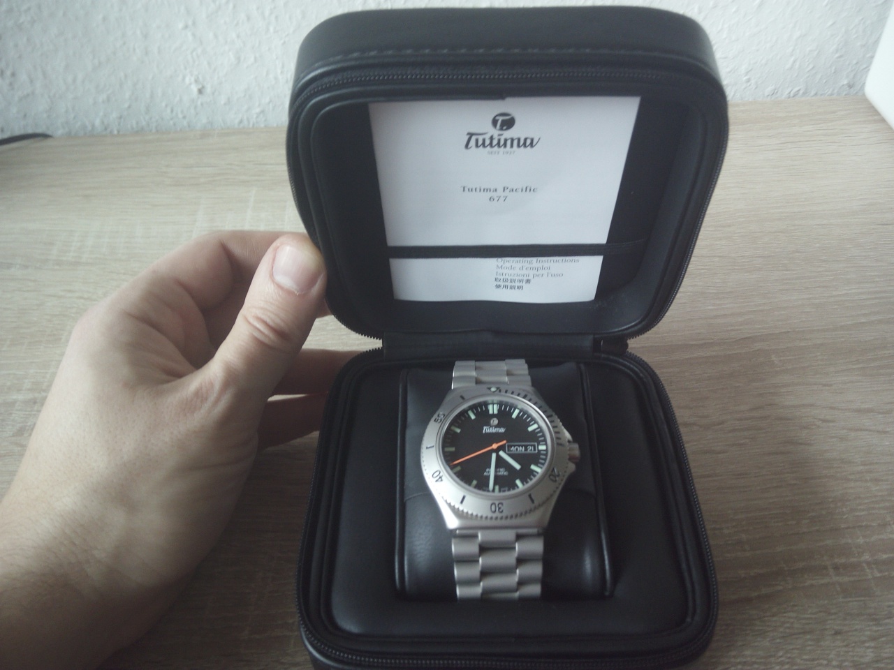 Около 3 лет назад я увидел Tutim Pacific впервые на витрине. В общем понравились, правда тогда как-то не зацепили. Потом были куплены SINN 356, но мы как-то так и "не стали друзьями":(. Sinn уходят в продажу. После некоторого разочарования снова вспоминаю о Tutima. Отзывы в немецких форумах самые что ни на есть положительные. Настоящие tool watch без компромиссов :cool: Итак, 4 дня уходят на поиски - эта модель больше не выпускается с 2014 года, так что найти почти не реально:confused:. Предложения о продаже в интернете на самом деле оказываются несерьёзными. Последняя надежда- тот магазин, где я их увидел около 3 лет назад. И там они ещё были:)! "Последние из Могикан"! Естественно, уже за гораздо большую цену:eek:. После торга мне скинули 150 Евро;), при условии что расплачусь наличными. Там же сразу укоротили браслет. И вот часы- мои:p