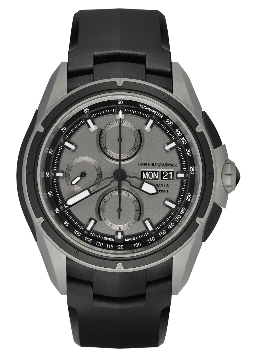 Круглый корпус новинки, изготовленный из титана, диаметром 45,0 мм, водонепроницаемый до 100 метров. Защищенная завинчивающаяся рифленая заводная головка расположена на 3 часах. Интегрированный в корпус черный безель с пятиминутными маркерами. Серый циферблат с черной тахиметрической шкалой на его периферии. Накладные часовые индексы, покрытые, как и часовая, минутная и секундная стрелки, люминесцентным составом белого цвета. Модель оснащена швейцарским автоматическим механизмом ETA Valjoux 7751, с функциями индикации часов, минут (посредством соответствующих центральных стрелок), секунд (на соответствующем малом боковом циферблате, расположенном на 9 часах), дня недели и даты (посредством соответствующих буквенного и цифрового указателей в прямоугольных апертурах, расположенных на 3 часах), а также с хронографом (центральная секундная стрелка, круглый аналоговый 30-минутный счетчик, расположенный на 12 часах и круглый аналоговый 12-часовый счетчик, расположенный на 6 часах). Поставляется на черном резиновом ремешке. Цена модели Emporio Armani Swiss made Sport составляет 1450 евро. Источник: http://www.watchtime.net/nachrichten...selworld-2016/ |