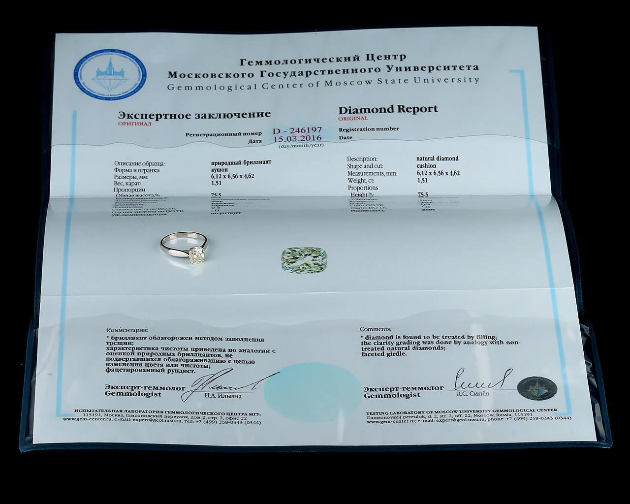 Бриллиант с сертификатом МГУ. Арт 150316/3 Золото 750 пробы Вес:2,57 грамм 1 Бриллиант огранки "кушон" 1,51ct. 8/9 Размер:16.75 НАША ЦЕНА - 150.000 руб Вложение 1378198Вложение 1378199Вложение 1378200Вложение 1378201Вложение 1378202 |