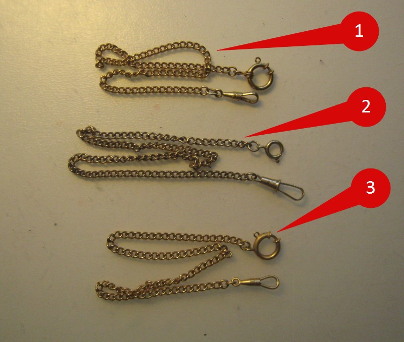 У меня есть поздняя желтая цепочка для карманных 2609.НА, показанная под номером 3, с большим кольцом. И несколько для хромированных, показанные под номером 2. |