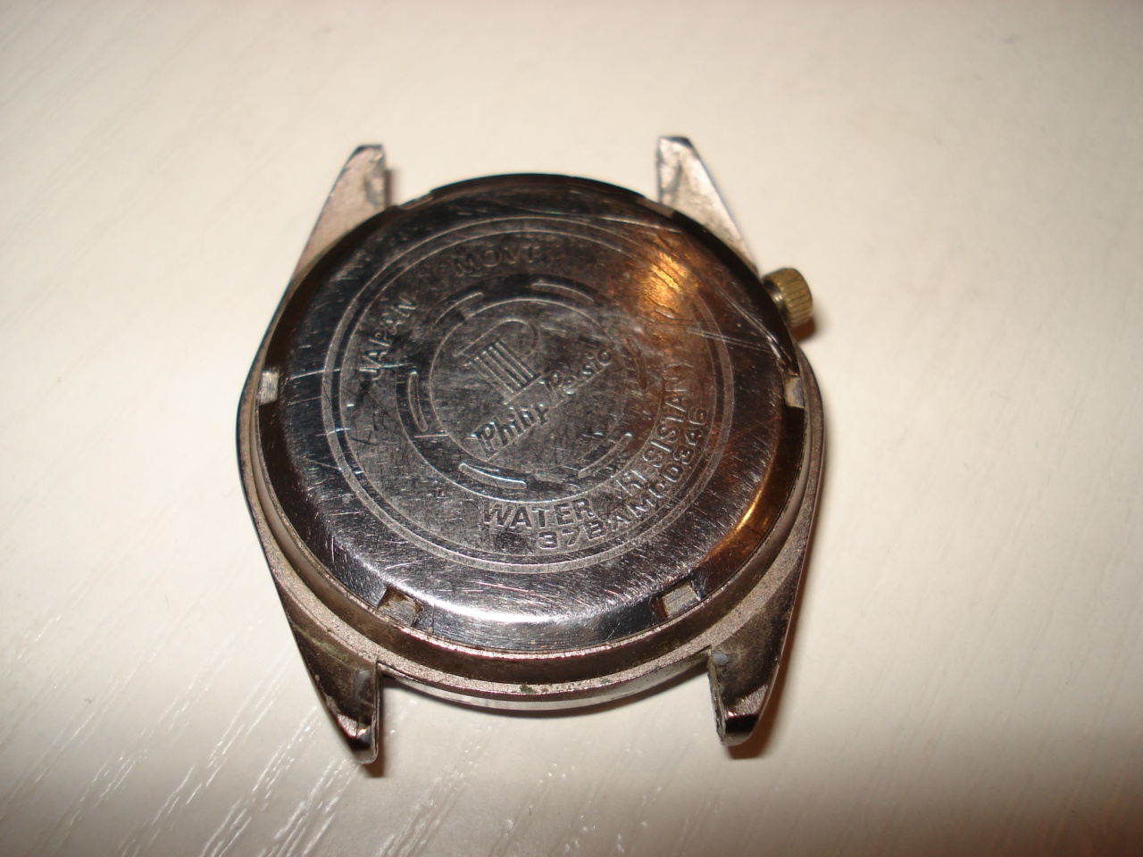 Конфисковал на днях у знакомого образец китайского производства весьма интересного содержания...корпус похоже из магниевого сплава (слегка стесал стружку от ушек, ярко вспыхивает от пламени так же как магниевый порошок :D), стекло обычный пластик, головка латунь, зад стайнлесс стилл но очень какой то царапающийся, на цифере стоит эмблема SEIKO и надпись филип персио :) вообщем похоже собрано на свалке из автозапчастей, но при всем этом механизм похоже miyota:confused:, за это чудо он отдал 150 руб в казани 5 лет назад :), но теперь как то жалко выкидывать стало, породнился что ли))