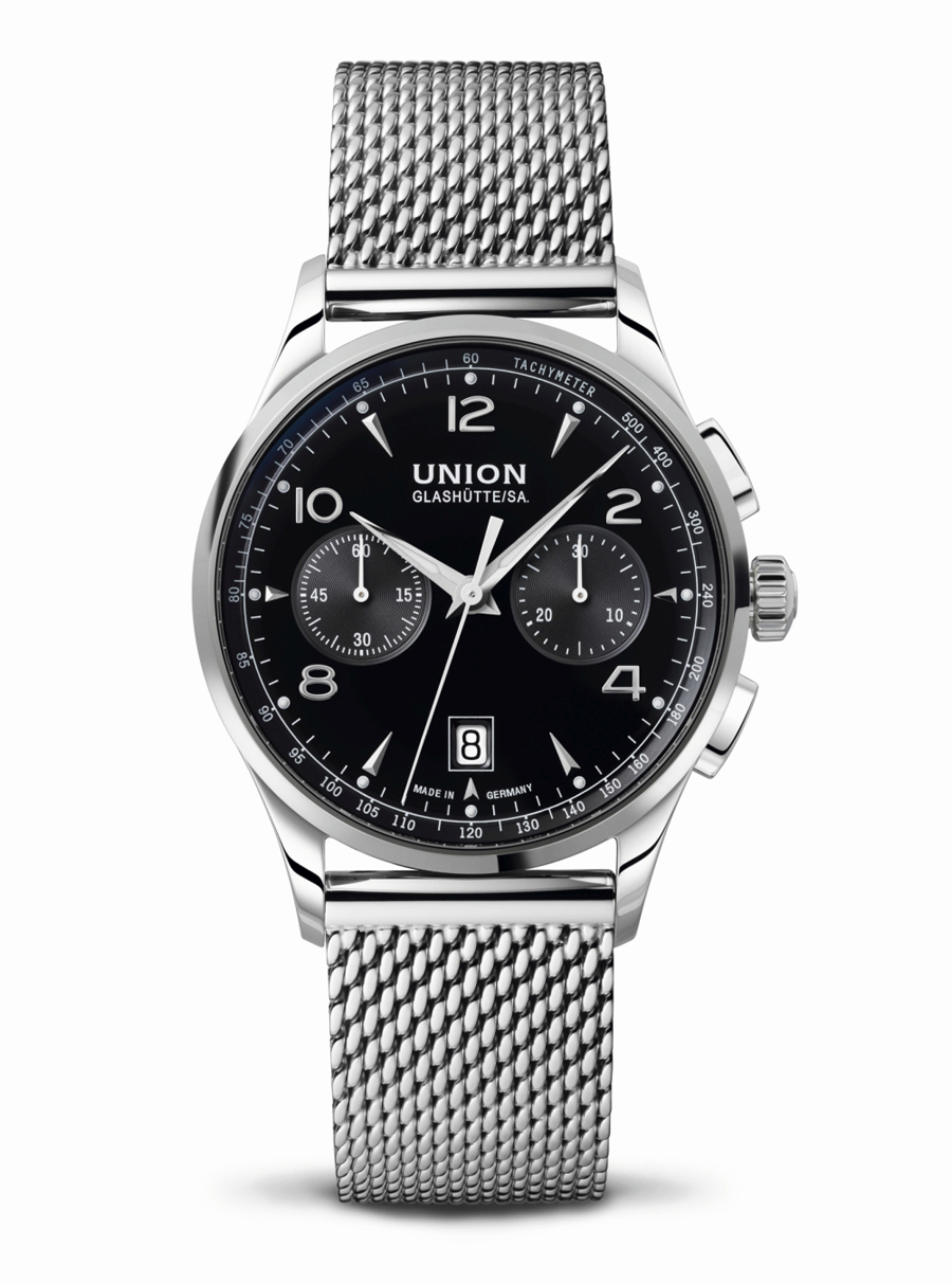Круглый полированный корпус новинки, изготовленный из нержавеющей стали, диаметром 42,0 мм. Рифленая заводная головка (с логотипом бренда Union Glashütte, выгравированным на ее торце) расположена на 3 часах, продолговатые пушеры хронографа - на 2 и 4 часах. Сапфировое стекло установлено на передней стороне корпуса и на его завинчивающейся задней крышке. Циферблат двухуровневый, матово-черного цвета, с накладными арабскими цифрами и гранеными треугольными часовыми индексами. Маленькие круглые часовые маркеры покрыты, как и часовая и минутная черные стрелки, люминесцентным составом белого цвета. На периферии циферблата расположена круглая тахиметрическая шкала. Модель оснащена швейцарским автоматическим механизмом Union Glashütte UNG-27.02 (базовый калибр ETA Valjoux 7753), с 60-часовым запасом хода, функциями индикации часов, минут (посредством соответствующих центральных стрелок), секунд (на соответствующем малом боковом циферблате, расположенном на 9 часах), даты (посредством соответствующего цифрового указателя в прямоугольной апертуре, расположенной на 6 часах), а также с хронографом (центральная секундная стрелка и круглый аналоговый 30-минутный счетчик, расположенный на 3 часах).