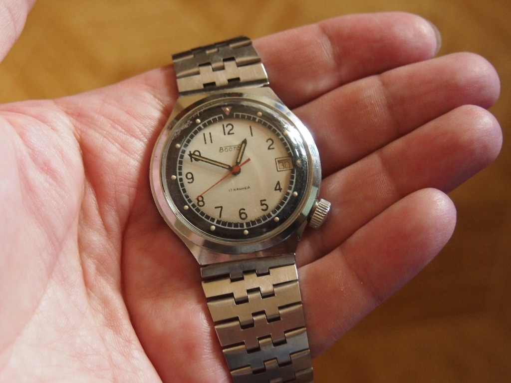 Уважаемые участники форума, попались вот такие часы-браслет Восток. Хотелось бы узнать, что это за модель? В интернете похожих не нашел, а именно с головкой на 4 часа (современные сделано в России видел, но сделано в СССР нет), да и местный часовой мастер (человек далеко не молодой) таких не видел за всю часовую деятельность. От себя - часы-браслет, 17 камней, сделано в СССР, водозащищенные, головка завинчивающаяся, механизм 2414. И сколько могут стоить по Вашему мнению? Спасибо за ответы.