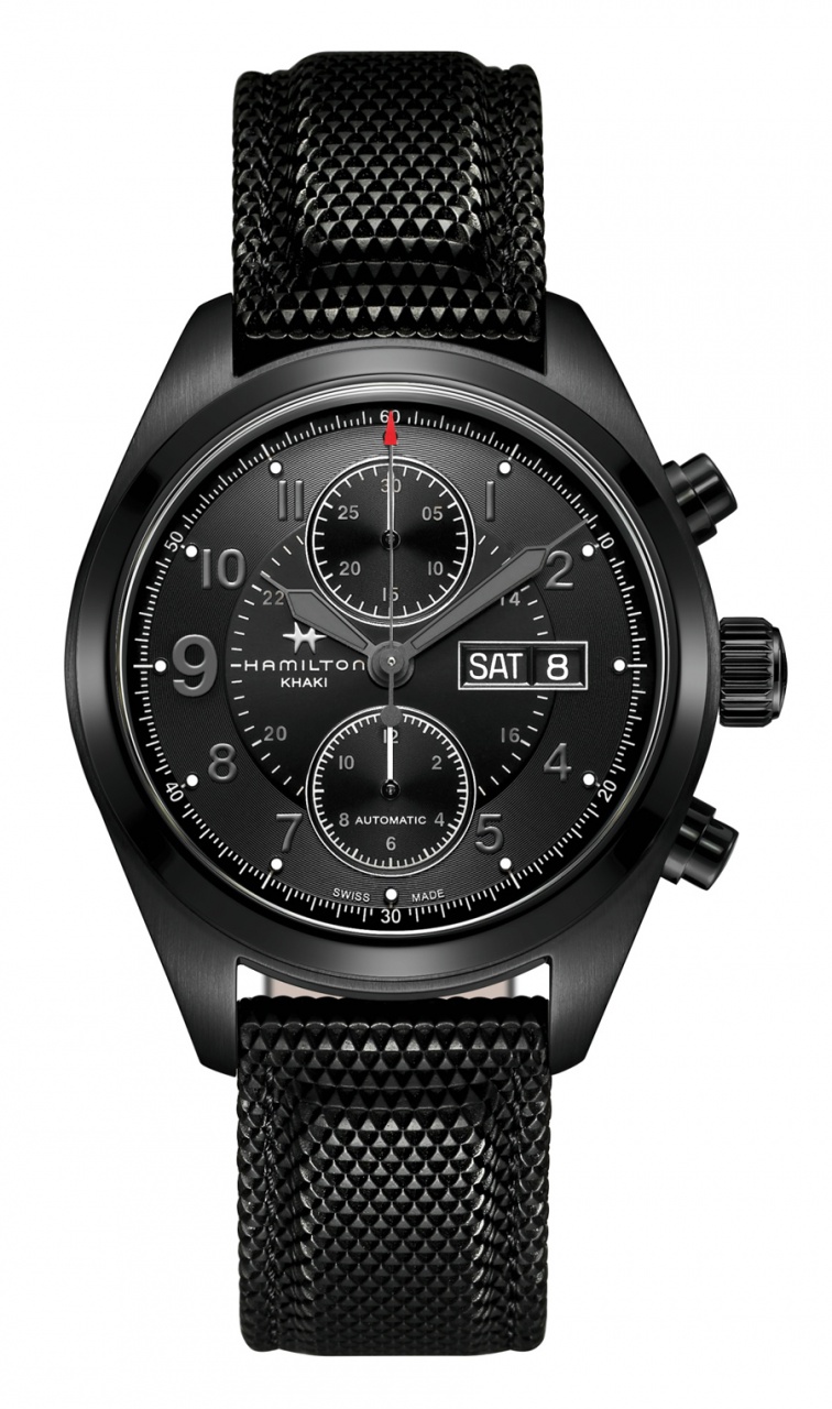 Новая модель Khaki Field Auto Chrono от швейцарской часовой компании с американскими корнями Hamilton имеет круглый корпус, изготовленный из нержавеющей стали с черным PVD-покрытием, диаметром 42,0 мм. На торце рифленой заводной головки, расположенной на 3 часах, выгравирован логотип бренда Hamilton. Сапфировое стекло установлено на передней стороне часового корпуса, а на его задней крышке - минеральное. Циферблат черный многоуровневый, частично гильошированный, с накладными арабскими цифрами и с маленькими круглыми часовыми индексами, покрытыми люминесцентным составом белого цвета. Часовая и минутная стрелки покрыты люминесцентным составом черного цвета. Модель оснащена швейцарским автоматическим механизмом Hamilton H-21 (базовый калибр ETA Valjoux 7750) с 60-часовым запасом хода, функциями индикации часов, минут (посредством соответствующих центральных стрелок), дня недели и даты (посредством соответствующих буквенного и цифрового указателей в сдвоенных прямоугольных апертурах, расположенных на 3 часах), а также с хронографом (центральная секундная стрелка с красным треугольным наконечником, круглый аналоговый 30-минутный счетчик, расположенный на 12 часах и круглый аналоговый 12-часовый счетчик, расположенный на 6 часах).