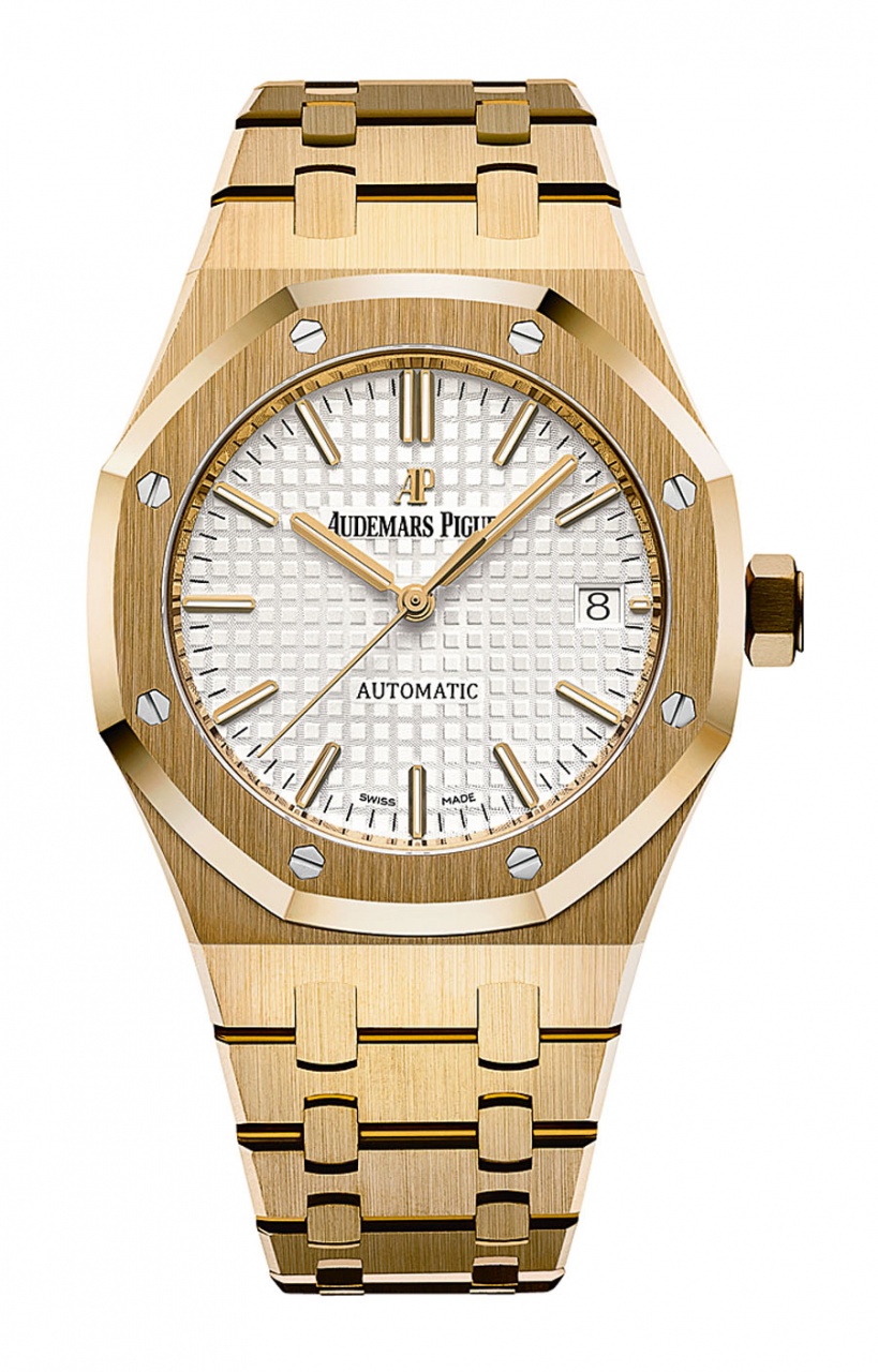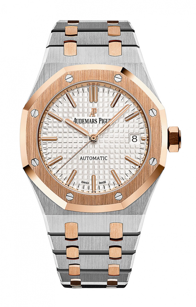 Новая версия модели Royal Oak Automatik от швейцарской часовой компании Audemars Piguet выпущена в двух вариантах: в 18-каратном желтом золоте и в биколорном (безель, заводная головка и скрепляющие звенья браслета изготовлены из 18-караьного желтого золота, а часовой корпус и браслет - из нержавеющей стали).