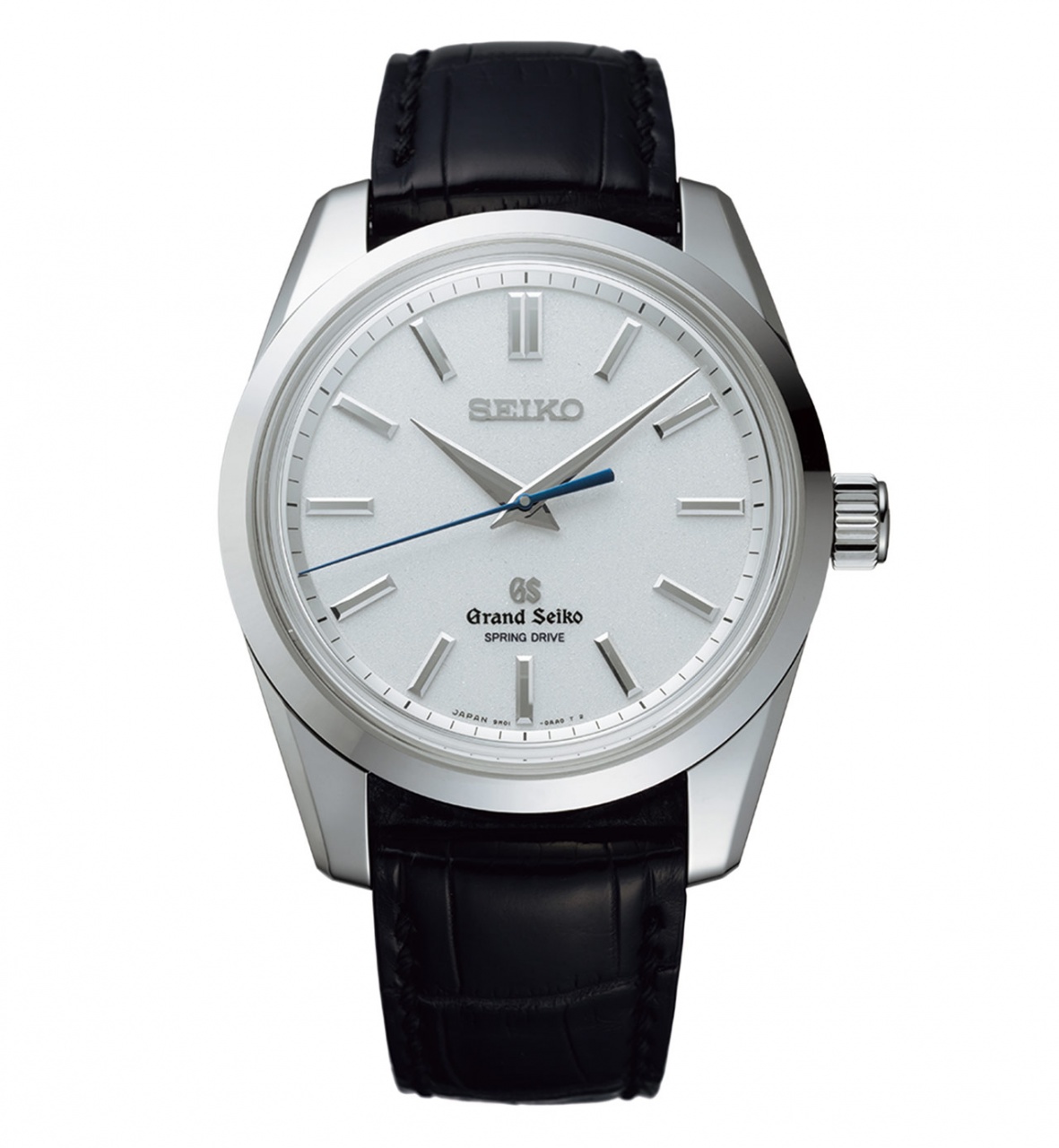 Новая модель Spring Drive 8 Day Power Reserve in Platinum (Ref. SBGD001) от японского часового бренда Grand Seiko имеет круглый полированный корпус, изготовленный из платины, диаметром 43,0 мм, толщиной 13,2 мм, водонепроницаемый до 100 метров. На торце завинчивающейся рифленой заводной головки, расположенной на 3 часах, выгравировано изображение логотипа бренда Grand Seiko. Сапфировое стекло установлено на передней стороне часового корпуса (выпуклое, с внутренним антибликовым покрытием) и на его завинчивающейся задней крышке. Серебристый циферблат с мелкозернистой отделкой, с накладными продолговатыми гранеными часовыми индексами и с сатинированными часовой и минутной стрелками. Секундная стрелка вороненая. Модель оснащена мануфактурным японским механизмом Seiko Spring Drive 9R01, состоящим из 307 деталей, на 56 камнях, с тремя заводными барабанами, восьмидневным запасом хода, точностью хода ± 0,5 секунды в сутки (± 10 секунд в месяц), функциями индикации часов, минут, секунд (посредством соответствующих центральных стрелок) и запаса хода (посредством соответствующего аналогового указателя, расположенного на задней стороне калибра и просматриваемого через сапфировое стекло на задней крышке часового корпуса). Механизм отлично отделан и декорирован.