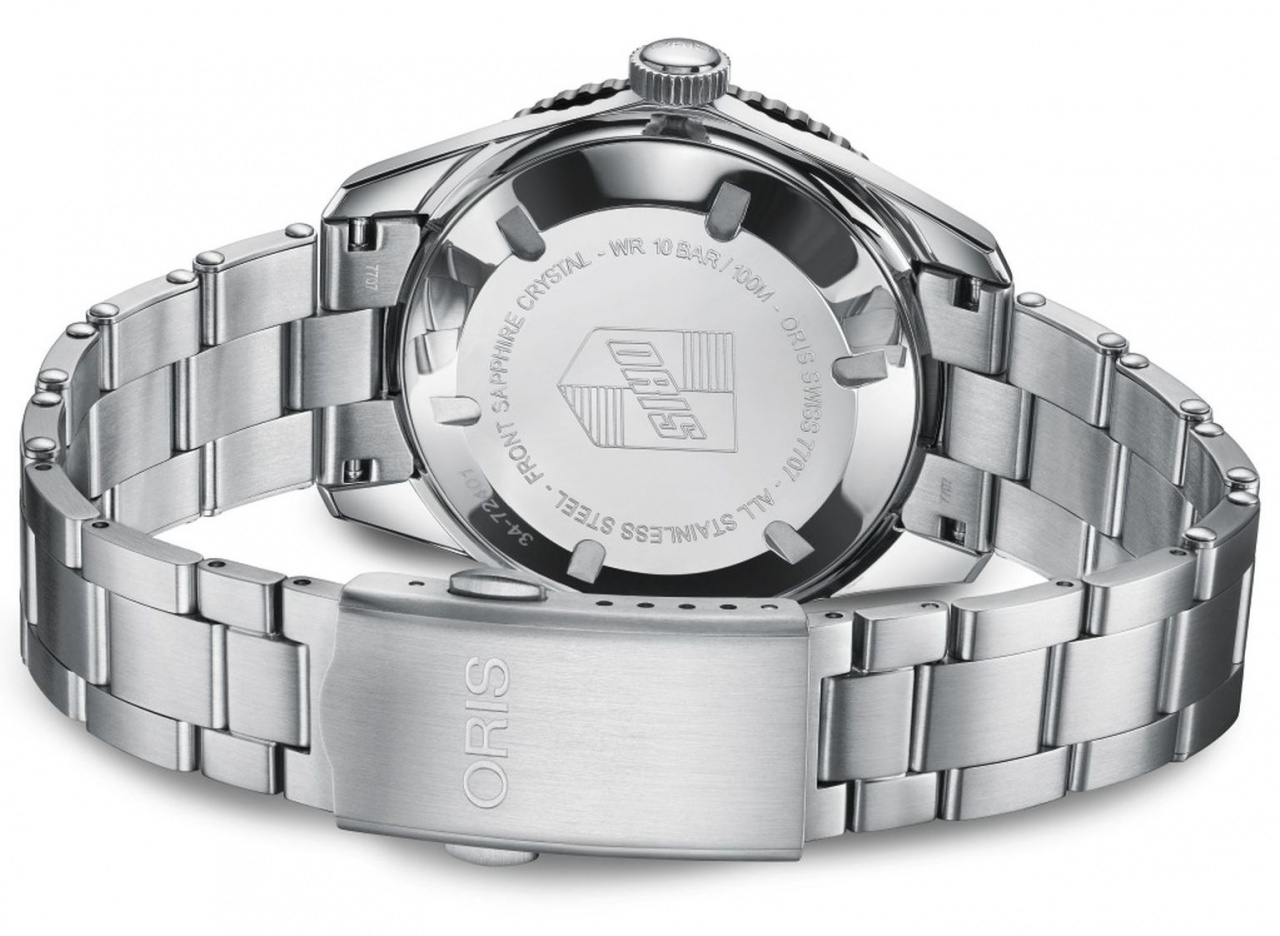 Многокомпонентный сатинированный круглый корпус, изготовленный из нержавеющей стали, диаметром 40,0 мм, водонепроницаемый до 100 метров. На торце завинчивающейся рифленой заводной головки, расположенной на 3 часах, выгравировано наименование бренда Oris. Однонаправленный вращающийся дайверский алюминиевый безель с черным покрытием. На завинчивающейся глухой задней крышке часового корпуса выгравировано изображение эмблемы бренда Oris, каким она была в шестидесятых годах предыдущего столетия. Выпуклое сапфировое стекло с внутренним антибликовым покрытием защищает выпуклый циферблат, с печатными арабскими цифрами, продолговатыми часовыми индексами и стрелками, покрытыми люминесцентным составом SuperLumiNova винтажного песочного цвета. Модель оснащена швейцарским автоматическим механизмом Oris 733 (базовый калибр Sellita SW200-1), с балансовой частотой 28800 полуколебаний в час (4 гц), функциями индикации часов, минут, секунд (посредством соответствующих центральных стрелок) и даты (посредством соответствующего цифрового указателя в прямоугольной апертуре, расположенной на 6 часах).