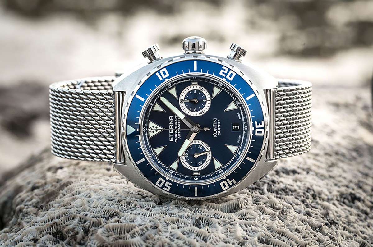 Цена модели Eterna Super KonTiki Chronograph "Blue" на синем текстурированном резиновом ремешке составляет 4650 евро, а на браслете из нержавеющей стали миланского плетения - 4850 евро.