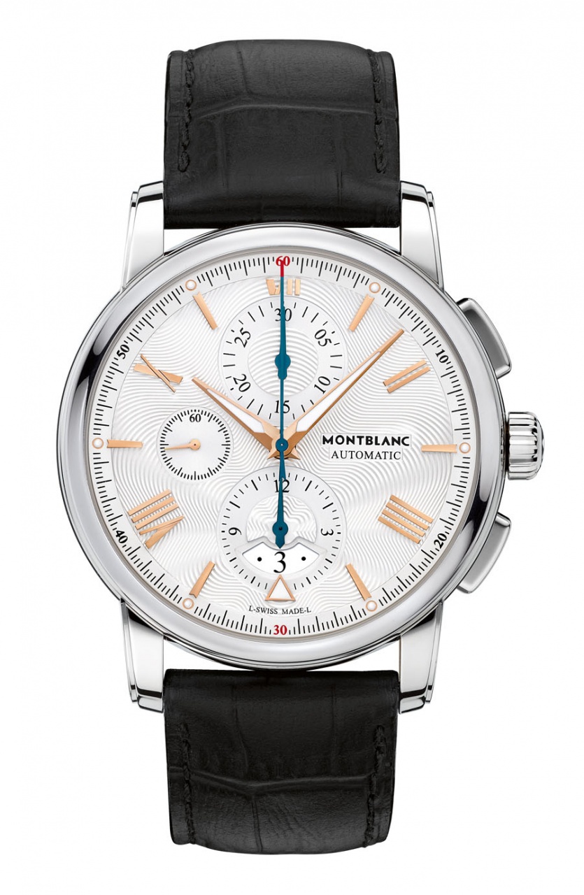 Круглый полированный корпус новинки, изготовленный из нержавеющей стали, диаметром 43,00 мм, водонепроницаемый до 50 метров. На торце рифленой заводной головки, расположенной на 3 часах, имеется инкрустированное изображение белой шестиконечной звезды - эмблемы бренда Montblanc. Продолговатые пушеры хронографа размещены на 2 и 4 часах. Сапфировое стекло установлено на передней стороне часового корпуса (с антибликовым покрытием) и на его завинчивающейся задней крышке. Серебристо-белый гильошированный циферблат с накладными позолоченными римскими цифрами и часовыми индексами. Люминесцентным составом белого цвета покрыты позолоченные часовая, минутная стрелки и круглые часовые маркеры. Стрелки хронографа вороненые.