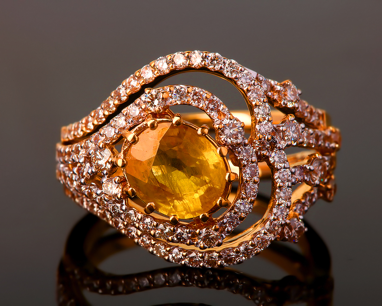 Представляем вашему вниманию ажурное золотое кольцо с синтетическим желтым сапфиром 1.47ct. и бриллиантами 1.32ct.