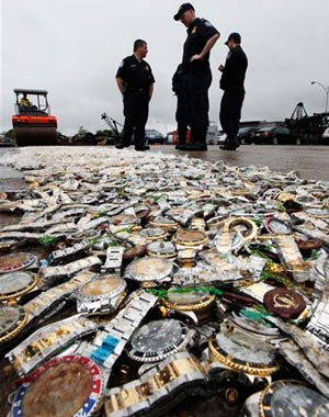 Более 7 000 поддельных часов Rolex было раздавлено в Филадельфии специальным катком в ходе выполнения постановления властей, потребовавших полностью уничтожить контрафактную продукцию.