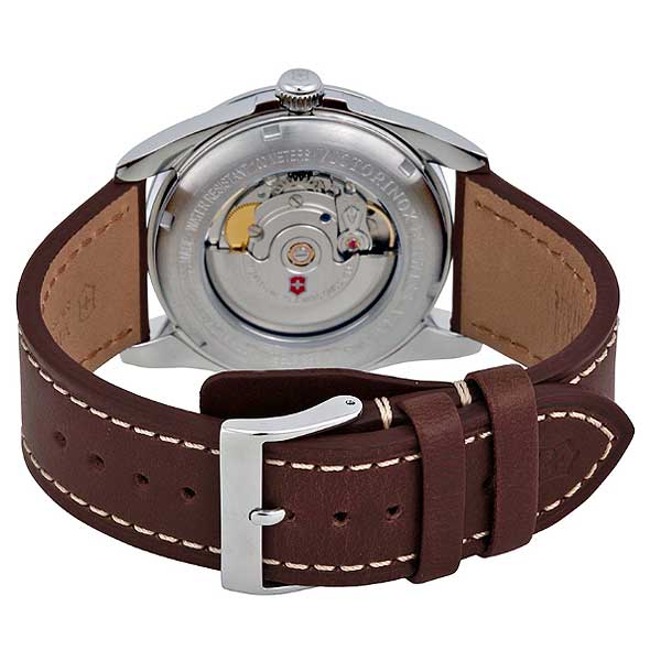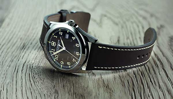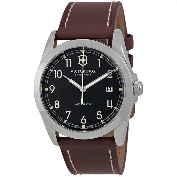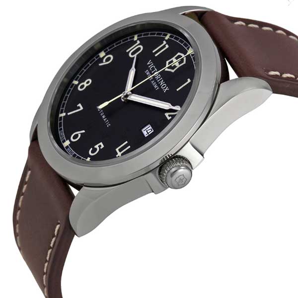 У новых Infantry Automatic от Victorinox все характерные признаки military-стиля, как говорится, налицо: стальной противоударный и водостойкий корпус, большой и хорошо читаемый циферблат с отчетливыми арабскими цифрами и минутной шкалой, светящиеся стрелки и часовые маркеры, лаконичная, но заметная секундная стрелка, сапфировое стекло с атибликовым покрытием и пр.