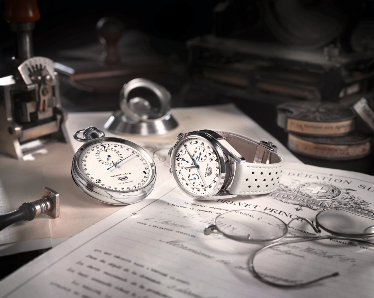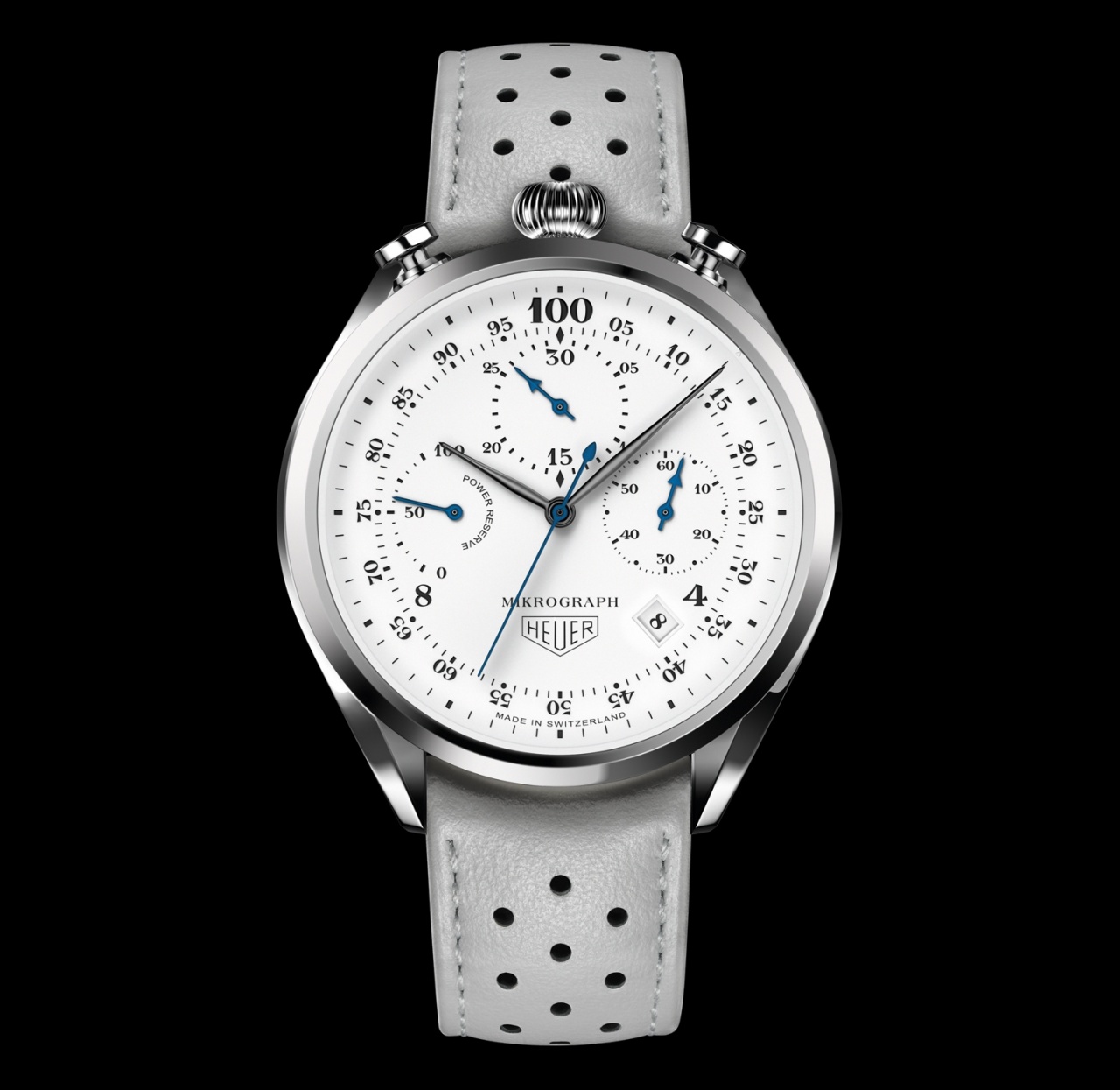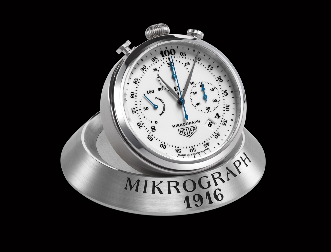 Циферблат модели, нанесенные черной краской часовые метки и винтажный логотип Heuer вкупе с надписью «Made in Switzerland» фотографически точно воспроизводят облик исторической модели Mikrograph 1916 года выпуска.