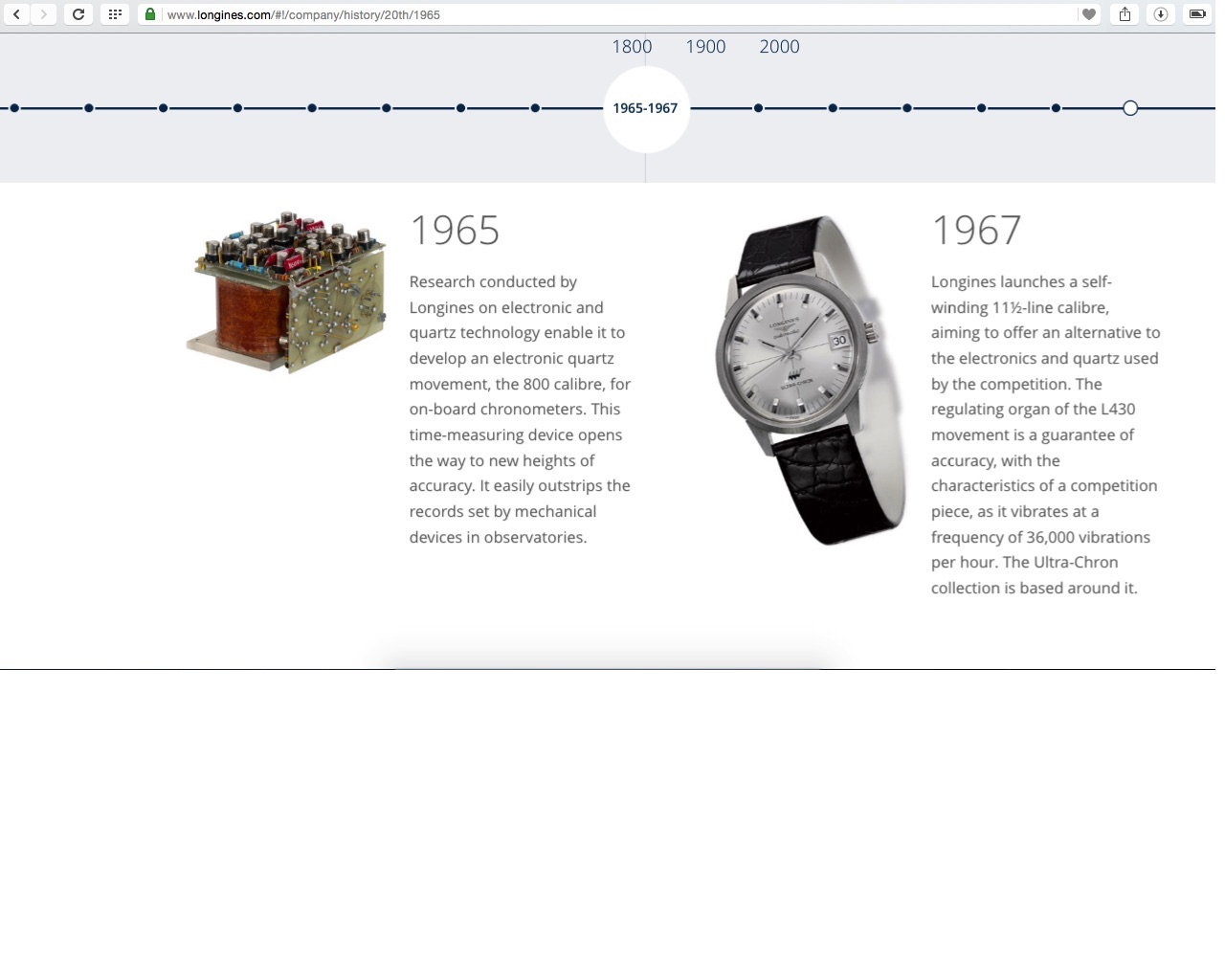 В 1967 году, в честь столетия Longines выпускает 11,5-линейный калибр с автоматическим заводом, который призван стать альтернативой электронике и кварцу, используемым конкурентами. Залог точности часов - регулирующий элемент механизма L430, который отличающийся такими же характеристиками, что и механизмы хода, разработанные для конкурсов точности. Его частота - 36 000 колебаний в час. Вся коллекция получила название Ultra-Chron.