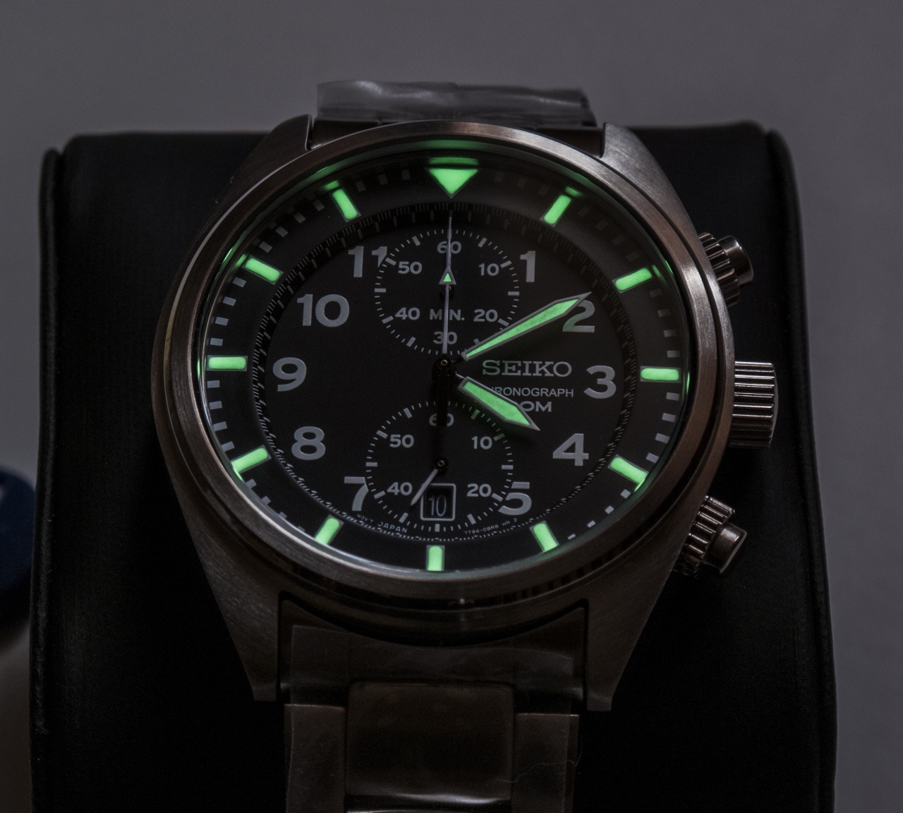 КОРПУС Корпус стальной, сочетает в себе полированные и брашированные элементы. Полированными выполнены боковины, задняя часть корпуса и боковая грань безеля. Брашированные соответственно верхняя часть корпуса, верхняя грань безеля и крышка. Сам безель тонкий металлический и естественно не вращающийся. Это придает часам более строгий вид. Заводная головка и кнопки незавинчивающиеся, хотя на кнопках и есть ребристые кольца, но они не крутятся - муляж. Хотя, при водозащите 100М не считаю это проблемой. Кнопки нажимаются достаточно туго. Вложение 1551902 Вложение 1551903 БРАСЛЕТ Тут особо говорить нечего. Браслет литой, крайние линки штампованные. Застежка раскладная, имеет две кнопки по бокам и дополнительный фиксатор. Снимается 4 звена с одной стороны браслета и 3 - с другой. На застежке есть 4 отверстия для микрорегулировки. И браслет и застежка по покам полированные, а с внешней и внутренней поверхности - брашированные. ЦИФЕРБЛАТ Циферблат - это то, что мне особенно нравится в этих часах. Он двухуровневый. На внешнем более высоком кольце расположены минутные и часовые метки, на внутреннем низком - цифры и дополнительные циферблаты. Переход между уровнями сделан наклонным, на эту плоскость нанесены секундные деления и деления в 1/5 секунды, по которым идет стрелка хронографа. На 12 часов располагается минутный накопитель на 1 час, стрелка на нем движется дискретно по 1 минуте. На 6 часов - рабочий секундный циферблат, в который уместили и окошко даты. Сама дата - белые цифры на черном фоне. Надо сказать, что такое расположение дополнительных циферблатов, шрифт, толщина линий их разметки выполнены таким образом, что абсолютно не мешают считыванию основного времени. Кстати, стрелки хронографа можно корректировать, если они не попадают в нули. об этом в инструкции написано. Вложение 1551901 ЛЮМ Тут все просто. Люм на сминутной и часовой стрелке, на часовых делениях внешнего кольца циферблата а так же на маленьком треугольничке секундной стрелки хронографа. Светит по первым ощущениям неплохо, на длительность еще не тестировал. Вложение 1551906 Вложение 1551907 Итак, общий вывод - часы очень приятные, не перегруженные, спортивностью и излишней брутальностью не отдают, в отличие от многих современных бюджетных сеек. Жена говорит, стиль авиаторов. Возможно и так. Я долго искал подобный хронограф, который можно надеть под рубашку, да и под костюм, если уж очень захочется. Наконец-то нашел :) Ну и напоследок еще пара фоток Вложение 1551904 Вложение 1551905 Принимаю поздравления и тапки :) |