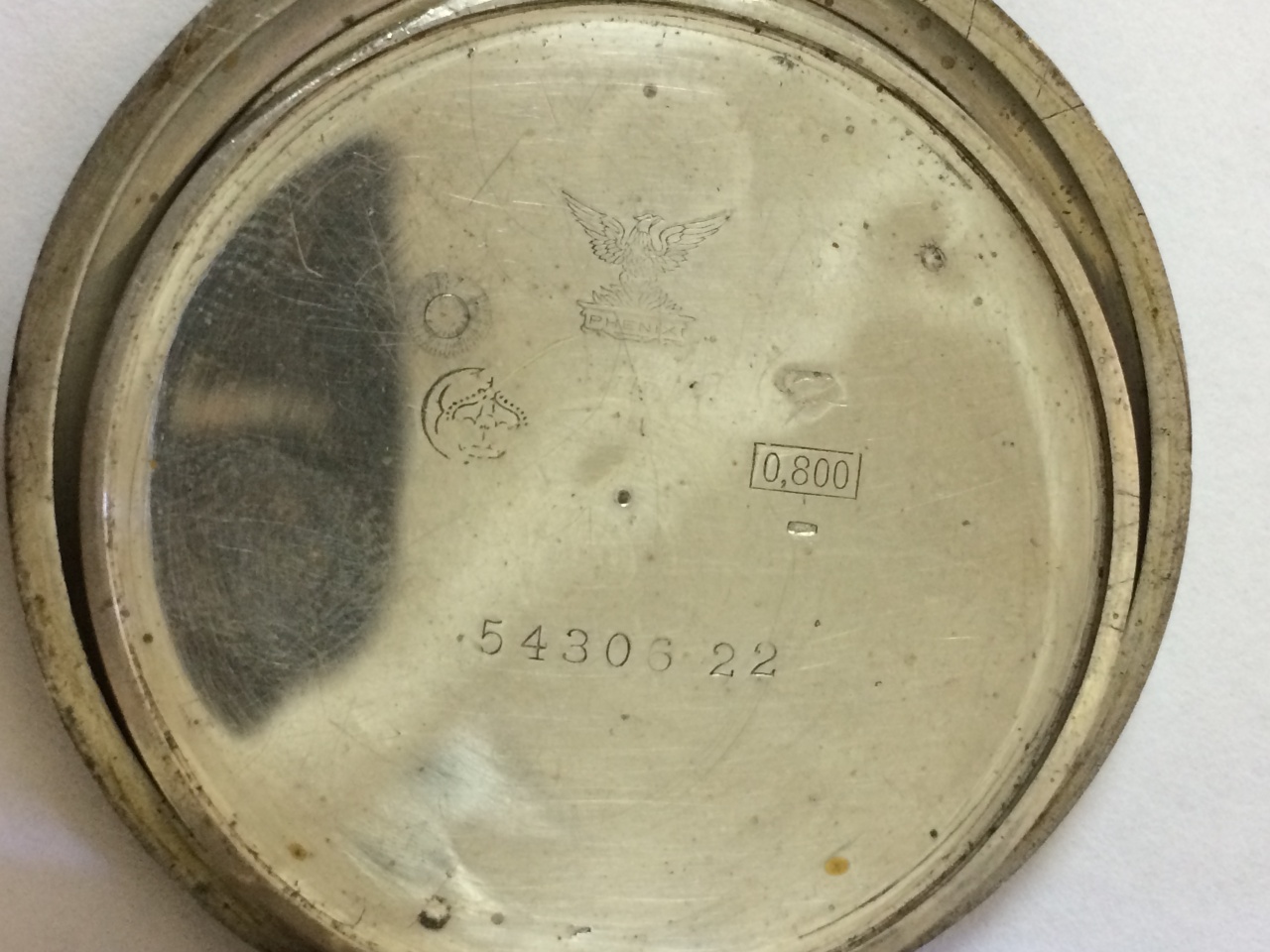 Доброго дня. Вопрос к опытным специалистам. От Деда достались карманные часы, т.к. Дед прошел всю войну (1941-1946), считаю их трофейными. Часы в не очень хорошем состоянии, но работаю (ходят) точно и без проблем. Так вот на крышках этих часов несколько клейм: орел с надписью "PHENIX", нечто вроде зонтика (по другому не могу ассоциировать клеймо ниже орла), круг с насечками, клеймо птицы тетерев большое и малое (по нему имею инфу., что это серебро 800 пробы), клеймо "молоточек" в нижней части обеих крышек, что обозначают цифры и о чём говорят клейма непосредственно на механизме. И как итог, кто производитель и год производства.