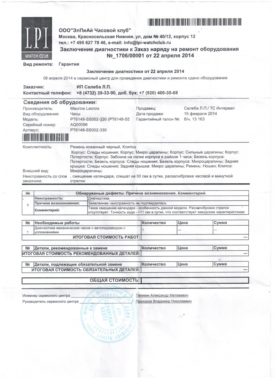 Добрый день. Такая вот у меня задачка. После покупки часов у оф.дилера (РТ 6148-SS002-330) по истечении 2-х месяцев обнаружил, что дата в окошке установлена не по центру, а смещена вправо. Обратился в магазин, откуда послали в сервис. Часы приняли, а через некоторое время я их получил с заключением LPI - смещение календаря это особенность данной модели. Я офигел и попытался связаться с Морис Лакруа на оф.сайте, где есть раздел "задать вопрос". Несколько попыток ни к чему не привели - тишина. Но сайт то работает и обновляется. А теперь сам вопрос - куда и кому писать, чтобы подтвердить или опровергнуть эту странную особенность (судиться не хочется, знаю что это такое, хочу по мирному попробовать). Спасибо.