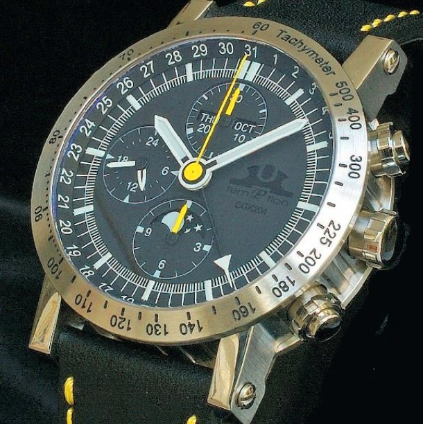 Корпус из нержавеющей стали, диаметром 43 мм. Модель оснащена отлично зарекомендовавшим себя автоматическим механизмом ETA Valjoux 7751. Черный ремешок из телячей кожи с желтой прошивкой. Цена составляет около $ 3000. Источник: http://www.wristwatchhaven.com/wrist...mption-cgk204/ |