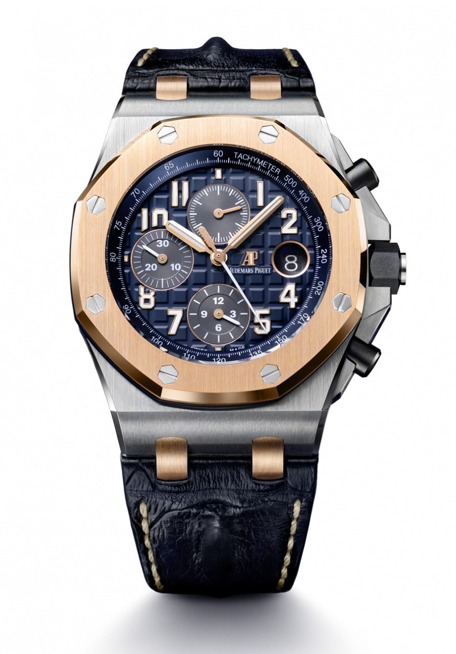 Новинка имеет сатинированный корпус, изготовленный из нержавеющей стали, диаметром 42,0 мм, водонепроницаемый до 50 метров. На торце защищенной завинчивающейся заводной головки с черным покрытием, расположенной на 3 часах, выгравирован логотип бренда Audemars Piguet. Пушеры хронографа, также с черным покрытием, размещены на 2 и 4 часах. Фиксированный фирменный безель (изготовленный, как и ушки, из 18-каратного розового золота) на восьми винтах, выполненных из белого золота. Сапфировое стекло с антибликовым покрытием защищает синий циферблат с отделкой "Grande Tapisserie", с накладными золотыми арабскими цифрами, покрытыми, как и золотые стрелки (кроме секундной стрелки на малом боковом циферблате, размещенном на 12 часах), люминесцентным составом белого цвета. На фланце циферблата расположена круглая тахиметрическая шкала, размеченная белыми арабскими цифрами. Модель оснащена мануфактурным швейцарским автоматическим механизмом Audemars Piguet 3126/3840, с функциями индикации часов, минут (посредством соответствующих центральных стрелок), секунд (на соответствующем малом боковом циферблате, расположенном на 12 часах), даты (посредством соответствующего цифрового указателя в круглой апертуре, расположенной на 3 часах), а также с хронографом (центральная секундная стрелка, круглый аналоговый 30-минутный счетчик, расположенный на 9 часах и круглый аналоговый 12-часовый счетчик, расположенный на 6 часах). Поставляется на синем ремешке из кожи аллигатора. В комплект поставки входит также синий каучуковый ремешок. Цена модели составляет 31400 евро. Источник: http://www.watchtime.net/nachrichten...chronograph-2/ |