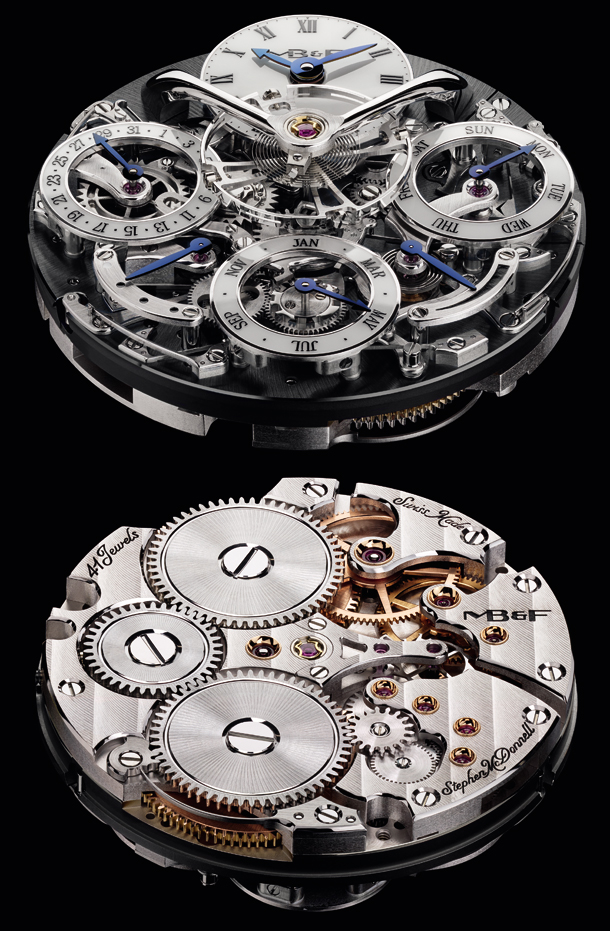 Начав с чистого листа, MB&F и независимый ирландский часовщик Стивен МакДоннел заново изобрели вечный календарь – самое известное часовое усложнение. Результатом этого стали завораживающие часы Legacy Machine Perpetual с механизмом собственного производства. Авторы уникальной модели полностью переосмыслили конструкцию, с тем чтобы избавиться от недостатков, свойственных традиционным вечным календарям. Помимо прочих преимуществ, календарь нового типа, управляемый «механическим процессором» (подана заявка на патент), притягивает взгляд своим необычным видом. Его можно рассмотреть во всех деталях со стороны циферблата. Модель LM Perpetual оснащена полностью интегрированным калибром 581 с новой системой автоматического вычисления количества дней в месяце (блок календаря здесь – не отдельный модуль, добавленный к базовому механизму, а его составляющая). Из эстетических соображений весь механизм вечного календаря открыт взору, что стало возможным благодаря отсутствию циферблата как такового. Производимый эффект подчеркнут размещенным сверху балансом, который словно парит над механизмом. Вложение 1592655 Вечный календарь – одна из самых известных классических сложных функций. Он автоматически учитывает разное количество дней в каждом месяце, а также принимает во внимание тот факт, что в високосные годы в феврале 29 дней. Однако традиционным вечным календарям присущ ряд недостатков: дата может переключиться раньше времени; попытка настроить указатель даты в момент смены показаний нередко приводит к его поломке; на работе вечного календаря сказывается функционирование других модулей, также управляемых базовым механизмом. Вложение 1592656 Полностью интегрированный механизм Legacy Machine Perpetual был разработан «с нуля», с тем чтобы решить все вышеописанные проблемы. Отныне никаких преждевременных переключений указателя даты и зависимости от действия других трансмиссий нет. Что касается кнопок настройки, они автоматически отключаются в момент переключения календаря. Обычно в вечном календаре за основу принимается 31-дневная продолжительность месяца. В том случае, когда в месяце меньше дней, лишние дни просто «пропускаются» во время переключения индикатора. Так, при смене показаний с 28 февраля на первое марта календарь «перескакивает» числа 29, 30 и 31. LM Perpetual переворачивает привычные представления о вечном календаре применением «механического процессора» вместо традиционной громоздкой архитектуры типа «grand levier» («большой рычаг»). Этот процессор берет за основу 28-дневную продолжительность месяца, к которой по мере необходимости добавляются дополнительные дни. Таким образом, каждый месяц индикатор будет отображать ровно требуемое количество дней, не перескакивая через ненужные числа. Кроме того, если в обычном вечном календаре для настройки високосного цикла необходимо вручную переключать месяцы (вплоть до 47), в модели LM Perpetual для этого предусмотрена специальная кнопка быстрой настройки. Вложение 1592657 Открытый циферблат позволяет во всех деталях рассмотреть оригинальное часовое усложнение и подвешенный баланс, гармоничное сочетание которых притягивает взгляд. Еще одно уникальное техническое решение воплотилось в удивительном балансе, словно парящем над механизмом, который соединен с модулем спуска с обратной стороны механизма колонк