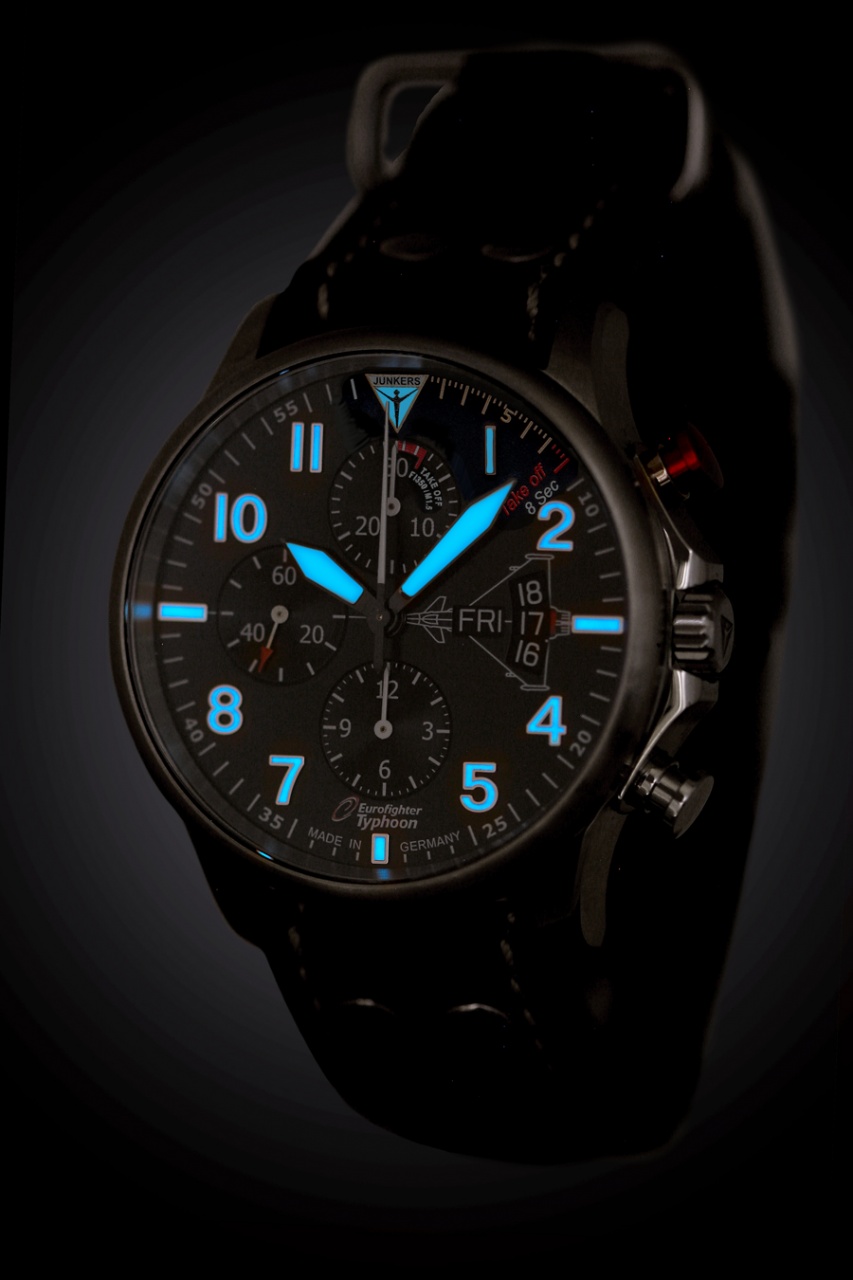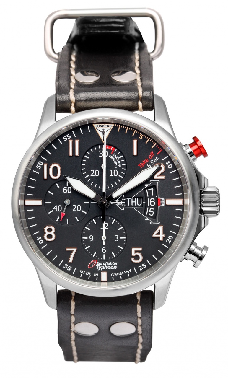 Круглый корпус новинки, изготовленный из нержавеющей стали, диаметром 42,0 мм. На торце защищенной рифленой заводной головки, расположенной на 3 часах, выгравирован логотип бренда Junkers. Пушеры хронографа размещены на 2 (окрашенный красным цветом) и 4 часах. Сапфировое стекло защищает циферблат черного или серого цвета, с накладными арабскими цифрами, покрытыми, как и часовая и минутная стрелки, люминесцентным составом белого цвета, светящимся во тьме голубым светом. На круглой напечатанной минутной шкале, расположенной на периферии циферблата, красным цветом отмечены первые восемь секунд (время, необходимое для взлета многоцелевого истребителя Eurofighter Typhoon). Модель оснащена швейцарским автоматическим механизмом ETA Valjoux 7750, с функциями индикации часов, минут (посредством соответствующих центральных стрелок), секунд (на соответствующем малом боковом циферблате, расположенном на 9 часах, посредством стрелки с красным наконечником), дня недели и даты (посредством соответствующих буквенного и цифрового указателей в прямоугольной и секторной апертурах, расположенных на 3 часах и вписанных в силуэт истребителя Eurofighter Typhoon), а также с хронографом: центральная секундная стрелка, круглый аналоговый 30-минутный счетчик, расположенный на 12 часах (на шкале которого красным цветом отмечены первые 150 секунд - время, необходимое для достижения максимальной скорости истребителя Eurofighter Typhoon - Mach 1,5) и круглый аналоговый 12-часовый счетчик, расположенный на 6 часах).