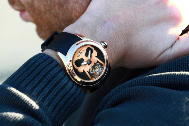 Мануфактура Corum представила новые часы Bubble 47 Flying Tourbillon. Корпус часов изготовлен из розового золота 18к, на черном циферблате расположено изображение черепа, выполненное в розовом золоте. На 6-ти часах расположен парящий турбийон.