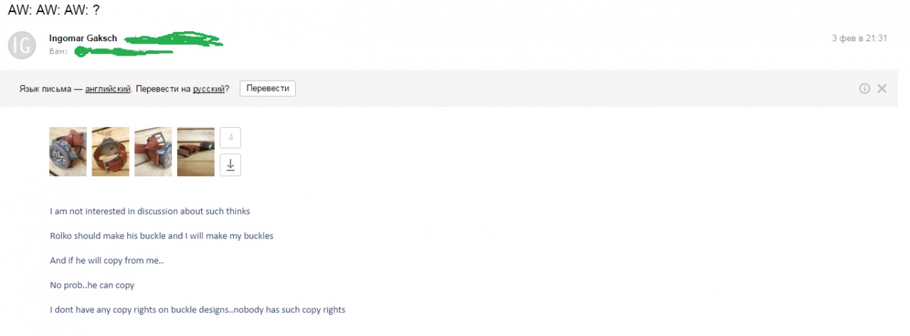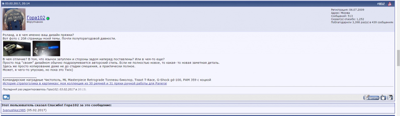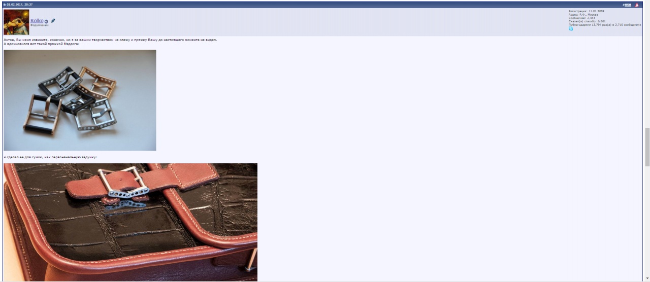 Вложение 1683505 И надпись "Бакля стальная, сделана во Франции по моему дизайну" Удивило. Дело в том, что подобная пряжка давно известная. У меня, такая же есть в пользовании. Купил полтора года назад у МэдДога. Его и считал автором пряжки. У Ролко таких пряжек раньше не видел, хотя плотно изучал в свое время изделия, как опубликованные на его сайте, так и сделанные, но не выставленные на продажу. Но кто знает, вдруг чего не знаю? Пишу Роланду вопрос в его теме. Вложение 1683506 Получаю ответ. Вложение 1683510 Уточняю Вложение 1683511 Отвечает. Вложение 1683512 Вложение 1683513 Заметно напряжение. Сравнивает пряжку на моем фото с пряжками МэдДога, предлагает разбираться с МэдДогом, даже умудряется найти какие-то отличия пряжки на моем фото от пряжек МэдДога. А ведь на фото и есть пряжка МэдДога. И отличий у нее от пряжек МэдДога нет) И отличий от пряжки "дизайна Ролко" почти нет. Почему почти? Ну потому что формально есть микроотличия: 1) потолще боковины, стоят они "наоборот" 2) щип чуть притуплен на конце Ну перевернуть боковины можно и на пряжке МэдДога. Для этого ее просто надо собрать "неправильно". А язычок с затуплением бывали у МэдДога. Но пока давайте внимательно изучим слова Роланда о "двойной" пряжке. "Вдохновился вот такой пряжкой Мэддога и сделал ее для сумок, как первоначальную задумку". Т.е. условно одна мастерская делает кожаную вещь и вешает туда фурнитуру, которую изобрела другая мастерская, пользуясь технической возможностью ее изготовление и добавляя толщины деталям для увесистости. Это уже не чистоплотно. В таком случае либо надо просто купить нужное количество пряжек у автора, либо как-то с ним договориться о самостоятельном выпуске. Фиксирую: Ролко не считает зазорным изготавливать изделия, в которых используются детали (пряжки), сделанные "пиратским способом", без ведома автора. Смотрим далее. Роланд пишет, что сделал двойную пряжку. Ну а потом пришла мысль ее "распилить" и "родилась" одинарная. О которой сейчас весь сыр-бор. И добавляет так, походя: "кстати, потом увидел, у Мэддога такую же..", располовиненную. Ну вроде как еще и не известно, откуда у МэдДога одинарная пряжка появилась, может у Роланда тот и подсмотрел) Любому здравомыслящему человеку понятно, что если МэдДог выпускает двойную пряжку, то уж мысль об одинарной ему пришла тоже, т.к. одинарная пряжка есть упрощение. Раз уж так часто здесь упоминается МэдДог, пора что-то уточнить и у него. Я пишу ему ряд прямых вопросов: 1. Ты придумал пряжку "техно"? Нигде не видел до этого? Не подсмотрел ли? 2. Как у тебя родилась идея пряжки "техно"? 3. Когда? И получаю внятные ответы: 1. Да, придумал он, ни у кого не смотрел и не копировал. 2. Идея родилась на основе рулевого колеса ретро-авто. И стала развитием пряжки Энеби. 4. Открыто он стал продавать пряжки более 4 лет назад (в качестве подтверждения дает ссыль на публикацию - я по ней перешел - двойная пряжка там есть). Вложение 1683522 Вложение 1683538Вложение 1683523 Вложение 1683524 Согласитесь, если взять пояснения Ролко и МэдДога, то как-то все становится очень просто. Один придумал и развил. Второй тиснул без зазрения совести сначала одно, а потом не ясно - то ли тиснул второе, то ли сам дошел (с опозданием от автора на месяцы или годы). Теперь, когда вступительная часть завершена, можно переходить к сути темы. Я хочу, чтобы все желающие высказали свое мнение: является ли нов