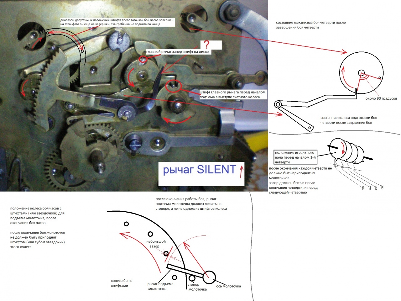 с чего начать настройку рычагов для правильного боя? цитата из 1-го сообщения буду выбирать изюм из лучших сообщений по этой теме. Я не часовщик, любитель часов с боем, четвертные часы следующий этап в новом хобби. Редактирование приветствуется путем добавления желательно в порядке проверки и порядке регулировки. На выходе планирую подробную инструкцию для неравнодушных к механике. От меня в конце темы видео работы механизма. 1. Механизм промыт, пружины протерты дисульфидом молибдена, шестерёнки установлены строго по фото (сделаны при разборке) , кроме 2-х ветряков и анкерной скобы. 2. Пробный завод на 2 оборота каждой пружины показывает четкую работу всех трех механизмов (бой, ход, четверти). -СПАСИБО DIMA 343 четырехзубый кулачок на минутном трибе поднимает одним из своих зубьев малый рычаг (на схеме chime flirt, у вас он как буква V на боку), малый рычаг в свою очередь поднимает большой рычаг, детент на оси большого рычага освобождает штифт колеса четвертей, но малый рычаг в поднятом состоянии своим выступом блокирует штифт колеса и бой не происходит, пока малый рычаг не соскочит с острия зуба четырехзубого кулачка как только малый рычаг соскакивает с зуба кулачка, рычаг падает и освобождает штифт колеса, бой запускается при этом большой рычаг остается приподнятым благодаря счетному колесу (chime locking plate), бой происходит до тех пор, пока большой рычаг не упадет в паз на счетном колесе и детент не заблокирует штифт колеса четверти бой часов активируется большим рычагом на счетном колесе в конце самой длинной секции, которая означает 4-ю четверть, есть подъем или бугорок: когда проигрывается 4-я четверть, большой рычаг наскакивает на этот бугорок и поднимается выше, чем обычно, своим дальним концом он поднимает рычаг рычаг-фиксатор гребенки (rack hook), гребенка падает на улитку, при этом на дальнем конце большого рычага есть выступ, который блокирует штифт на колесе боя часов до тех пор, пока рычаг поднят и четвертной бой не закончится когда большой рычаг падает во впадину на счетном колесе, он освобождает штифт колеса боя часов и бой часов начинается 3.Сразу вопрос: где находятся штифты колеса четвертей и колеса боя при установке рычагов и счетного колеса? |