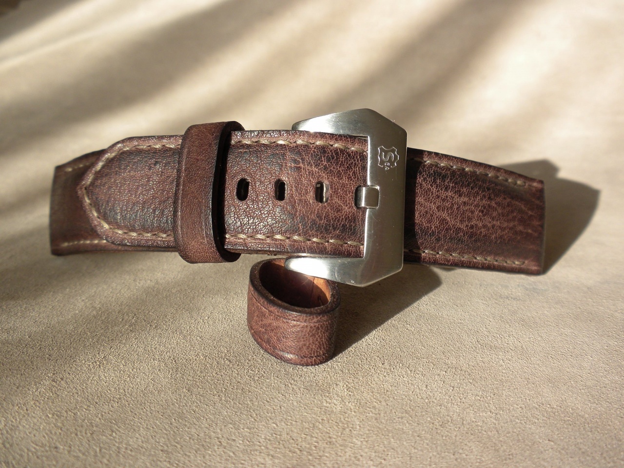 1. Ремешок из телячей кожи с эффектом старения, по всей длине ремешка лежит небольшая подушка у основания она толще и имеет плавный спуск к дыркам.