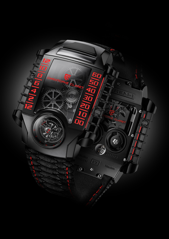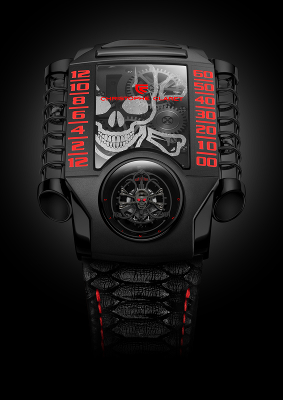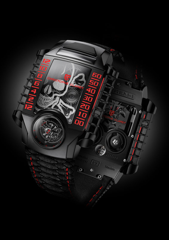 Новая модель обладает теми же передовыми характеристиками, что и предшественница (наклонный парящий турбийон с системой ретроградной индикации часов и минут, работающий под действием магнитных полей), однако ее дизайн подвергся значительным изменениям. Часы X-TREM-1 - StingHD оснащены титановым корпусом с черным PVD-покрытием, декоративным элементом в виде черепа на каретке турбийона и ремешком, выполненным из кожи ската или другого материала по выбору владельца. И немного мистики: стоит только сапфировому стеклу почувствовать тепло дыхания, как на нем проявляются очертания черепа. Компания StingHD, законодатель мод из Нью-Йорка, специализируется на производстве аксессуаров и высококачественных ювелирных изделий из кожи и других материалов вот уже более 50 лет. Сочетание эстетического совершенства и авангардной механики делают модель X-TREM-1 - StingHD прирожденным бунтарем. Изысканные, многогранные и экстремальные часы предназначены, прежде всего, для «плохих парней», для тех, кто не боится перемен в жизни, для рокеров, которые ценят механику и следят за последними трендами. Технология как ультиматум Смелая идея: использовать в часах источник магнитных полей, которые являются врагом номер 1 для часовой механики? Однако конструкторы Christophe Claret сделали это посредством системы, состоящей из двух маленьких полых сфер из стали, которые заключены в две сапфировые трубки, размещенные справа и слева на боковой поверхности корпуса. Сферы передвигаются под действием двух миниатюрных магнитов, которые, в свою очередь, перемещаются при помощи тросиков. Речь идет о невероятно эластичных нитях, сплетенных из нановолокон дайнима, которые удерживаются вместе благодаря суперпрочному полиэтиленовому гелю, способному выдержать растягивающее усилие предмета массой один килограмм. Каждая такая нить – тоньше волоса (диаметром 0,04 мм). Прочность волокон была протестирована на мануфактуре при помощи специального инструмента, имитирующего нагрузку, соответствующую 6 годам работы механизма. Данная технология была разработана в сотрудничестве с Высшей школой инжиниринга и управления кантона Во (HEIG-VD), расположенной в Ивердоне-ле-Бан, и командой профессора Бессона. Конструкция целиком и отделка часов соответствуют требованиям, регулярно предъявляемым Кристофом Кларе. Платина изогнутой формы и мосты изготовлены из сверхлегкого титана. «Парящий» турбийон крепится на высокопрочном двойном керамическом шарикоподшипнике, что позволяет увеличить его устойчивость к ударам. Он наклонен под углом 30 градусов, чтобы при ношении владелец часов мог видеть его максимально хорошо. Данная модель имеет систему ручного завода и два заводных барабана. Такое решение обусловлено необходимостью обеспечивать довольно энергозатратную индикацию и при этом сохранять точность работы турбийона и, следовательно, хода часов. Первый заводной барабан обслуживает турбийон, второй – индикацию часов и минут. Стиль без границ Что сразу бросается в глаза – большой наклонный турбийон, размещенный на отметке «6 часов» и украшенный черным хромированным алюминиевым черепом, разработанным компанией StingHD. Для создания этой детали, черепа с рубиновыми глазами внутри турбийона, необходимо было разработать новую каретку и поместить ее корпус огромного размера X-TREM-1 - StingHD. Подобно мощно