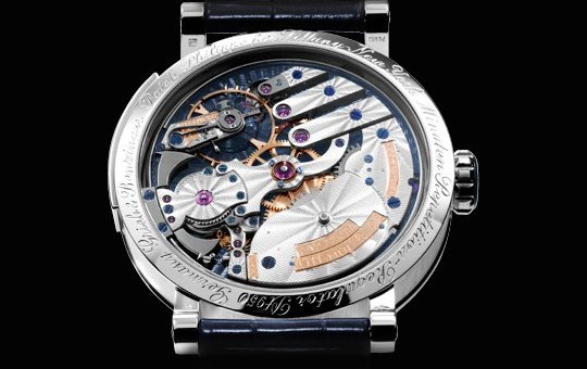 Сердцем нового уникального произведения часового искусства от Grieb & Benzinger является оригинальный механизм Patek Philippe с минутным репетиром, созданный специально для ювелирной компании TIFFANY приблизительно в 1887 г. Для того, чтобы превратить часовой механизм в часы-регулятор мастерам Grieb & Benzinger понадобилось подвергнуть его множеству процессов – начиная от реставрации и заканчивая ручной гравировкой и нанесением покрытия из платины. Прозрачная задняя крышка позволяеет в полной мере оценить красоту отделки механизма.