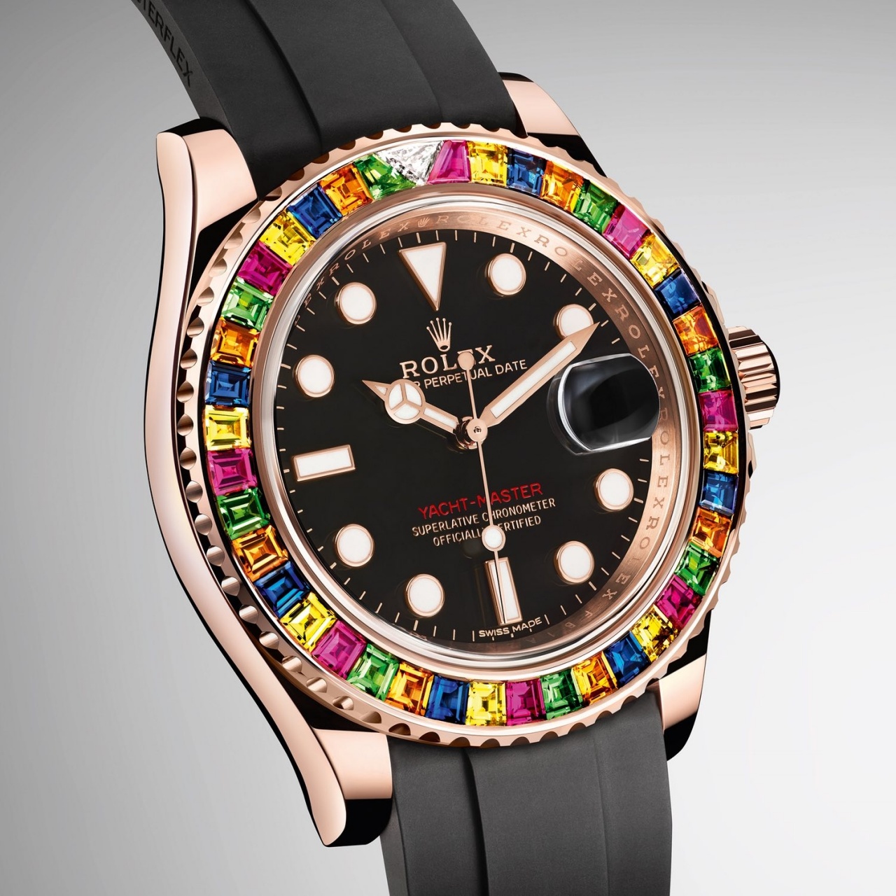 За время существования коллекции Yacht-Master модели линейки выпускались в корпусах разного диаметра – от 35 до 40 мм. В 2017 году 40-миллиметровая версия впервые украшена 3 видами драгоценных камней, использованных в отделке безеля. Сапфиры и цавориты 5 разных цветов чередуются друг с другом, создавая яркий спортивный образ, завершающим штрихом в котором выступает бриллиант треугольной огранки, расположенный у отметки 12 часов.