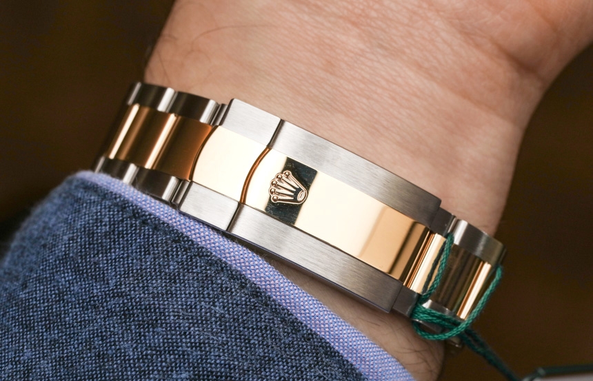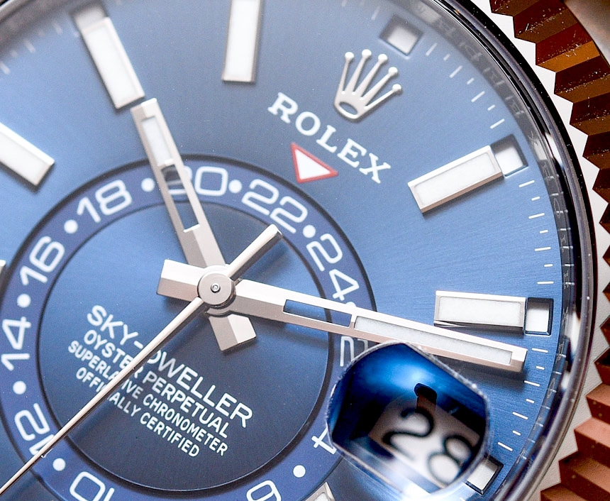 Второе новшество касалось особенностей использования безеля. Последовательным поворотом безеля до характерного щелчка пользователь переключается между режимами перевода часовой, и минутной стрелки и перевода указателя даты, который синхронизирован с окошками указателя месяцев. Работу часов обеспечивает калибр Rolex 9001, оснащенный 72-часовым запасом хода.