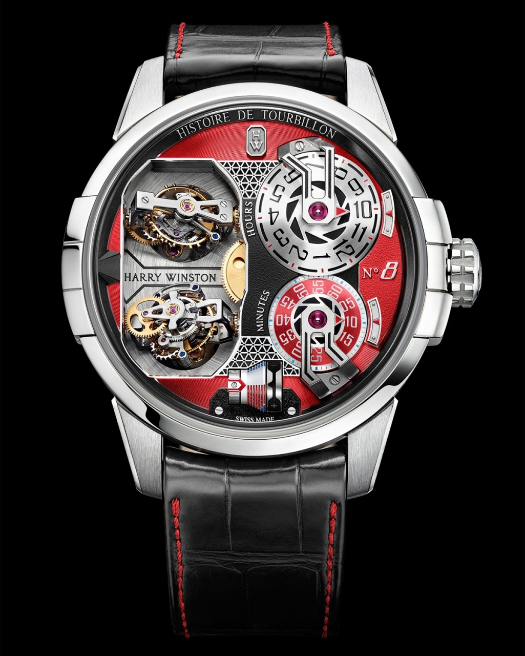 Histoire de Tourbillon 8 – это также история применения различных материалов. Материалы для этой модели были отобраны за их технологические свойства и эксклюзивный характер, а также за высокий дизайнерский потенциал и возможность выполнения уникальной ювелирной отделки. Корпус диаметром 51 мм изготовлен полностью из белого золота. Чередование зеркально полированных и сатинированных поверхностей зрительно выделяет различные детали отделки, как, например, три арки Harry Winston в положениях «3» и «9 часов». Скошенные фаски на циферблате замыкают обширное пространство, отведенное для торжественного вращения турбийонов. Циферблат представляет собой единый компонент, состоящий из 13 различных элементов. Отличительными чертами дизайна являются разнообразие поверхностей с разными видами отделки – пескоструйной, зернистой, сатинированной, лакированной, ячеистой, – выполненной с исключительной тщательностью, а также применение уникальной техники гравировки для нанесения букв. Модель представлена в двух версиях разных цветов, каждая из которых выпущена ограниченной серией из 10 экземпляров. Для первой версии был избран чистый антрацитовый цвет, для второй – сочетание темно-серого с ярко-красным, акцентирующим края циферблата, минутный счетчик и выполненную вручную строчку ремешка.