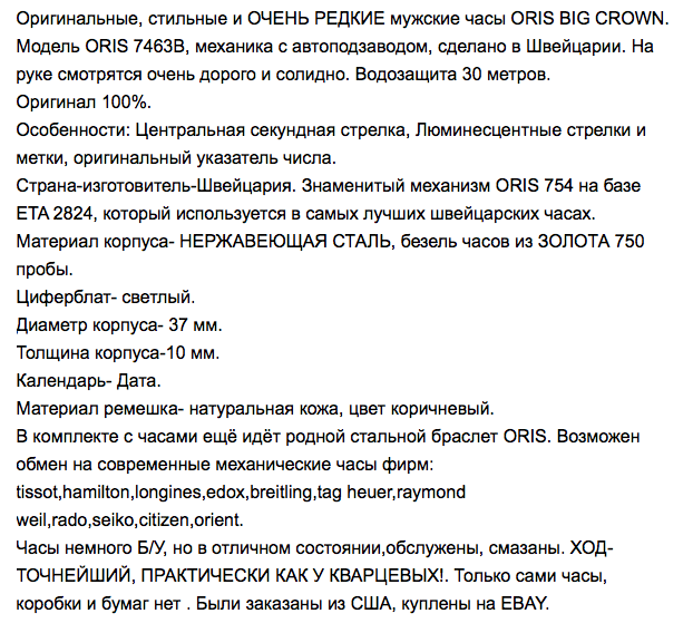 Собственно я знал что именно продаю потому цена была снижена, и был оговорен разумный торг, что в итоге и произошло. меня не интересует текущая цена часов, дело во вранье которое написано в обьявлении. Собственно ничего удивительного в этой ситуации нет, просто я хочу предупредить тех кого возможно заинтересовало это обьявление. Итак часы я приобрел путем обмена у одного из форумчан, и через год решил с ними расстаться. Часы как и браслет требуют полировки и обслуживания хотя действительно нареканий по точности хода у меня не было. оба стекла так же требуют полировки. Браслет расшатан. Вложение 1756516 Вложение 1756517 Вложение 1756518 Вложение 1756519 |