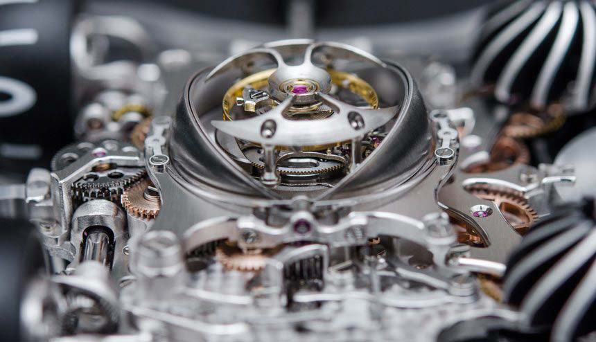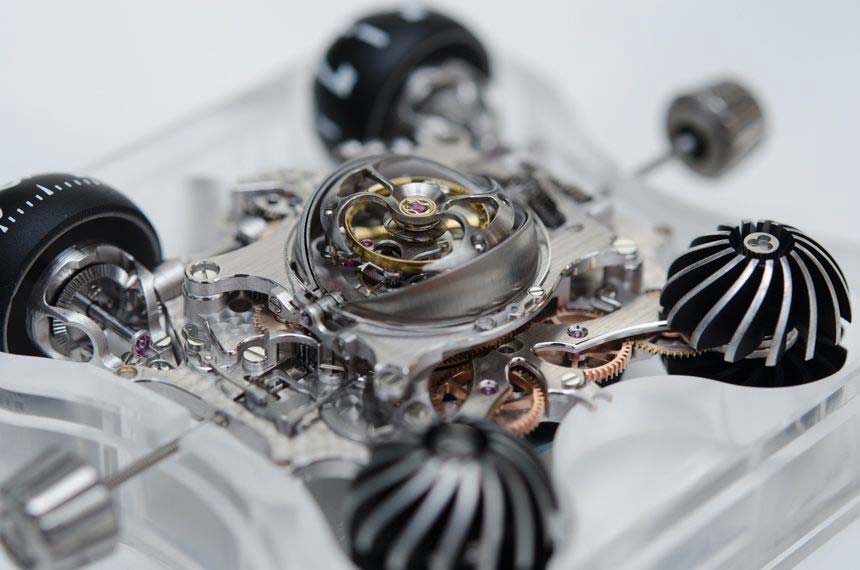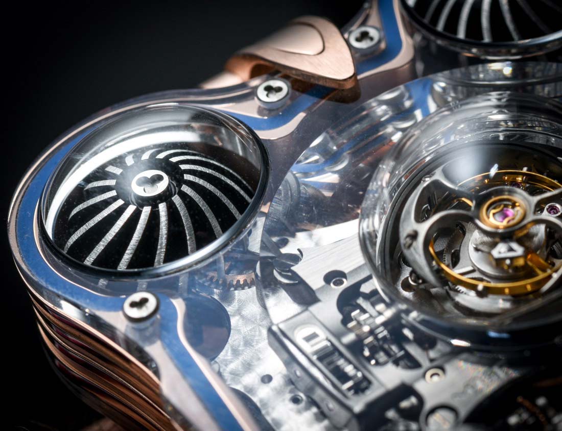 В сапфировых пластинах часов MB&F HM6 Sapphire Vision в общей сложности девять куполов: четыре на дне и пять на верхней пластине. Каждая деталь выточена из твердого кристалла сапфира, второго самого твердого природного минерала на Земле после бриллиантов. Для получения таких странных форм спецами MB&F использовались инструменты с бриллиантовыми наконечниками. Процесс кропотливый и длительный: обработка каждой пластины занимает сотни часов.