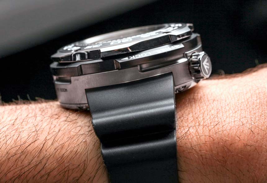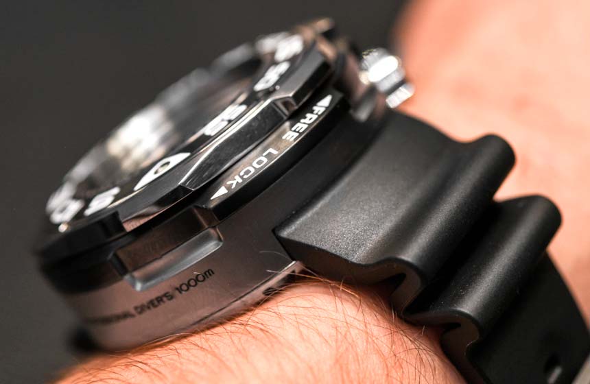 Профессиональные дайверские часы Citizen Eco-Drive Promaster Professional Diver 1000m оснащены новой системой блокировки лицевой панели. Качество исполнения на высоте. На запястье часы выглядят как целая стопка простых. Циферблат почти целиком занимает запястье. Свечение люминофора интенсивное. При ширине 52,5 мм и толщине 21,4 мм – эти часы не назовешь изысканными, и у них еще брутальный толстый резиновый ремешок, соответствующий общему стилю. Цена Citizen Eco-Drive Promaster Professional Diver 1000m составляет $ 2300.