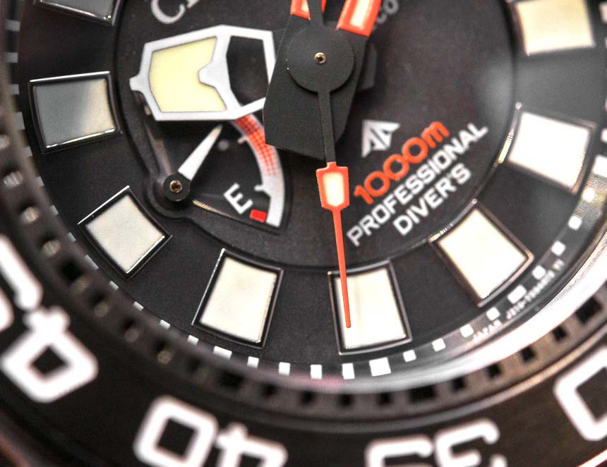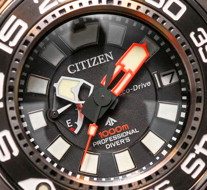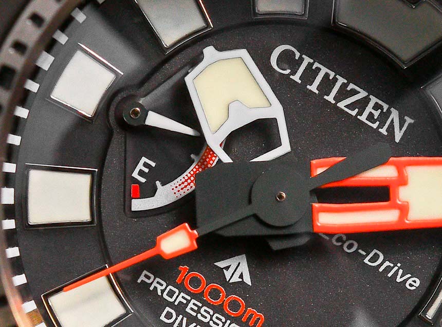 Хотя это не новая функция для Citizen, на циферблате Citizen Eco-Drive Promaster Professional Diver 1000m есть индикатор запаса хода кварцевого механизма на текущем уровне зарядки батареи. К слову об автономности работы: производитель гарантирует, что новые часы Eco-Drive могут проработать в течение нескольких месяцев без единого лучика света для их фотоэлемента (в действительности, кварцевый механизм Citizen J210 Eco-Drive внутри часов может продержаться на ходу 2,5 года на полной зарядке). Но если вы собираетесь погрузиться на глубину, удостовериться в достаточном заряде аккумулятора не помешает. Если это не так, часам хватит нескольких часов на солнце, чтобы подзарядиться полностью.