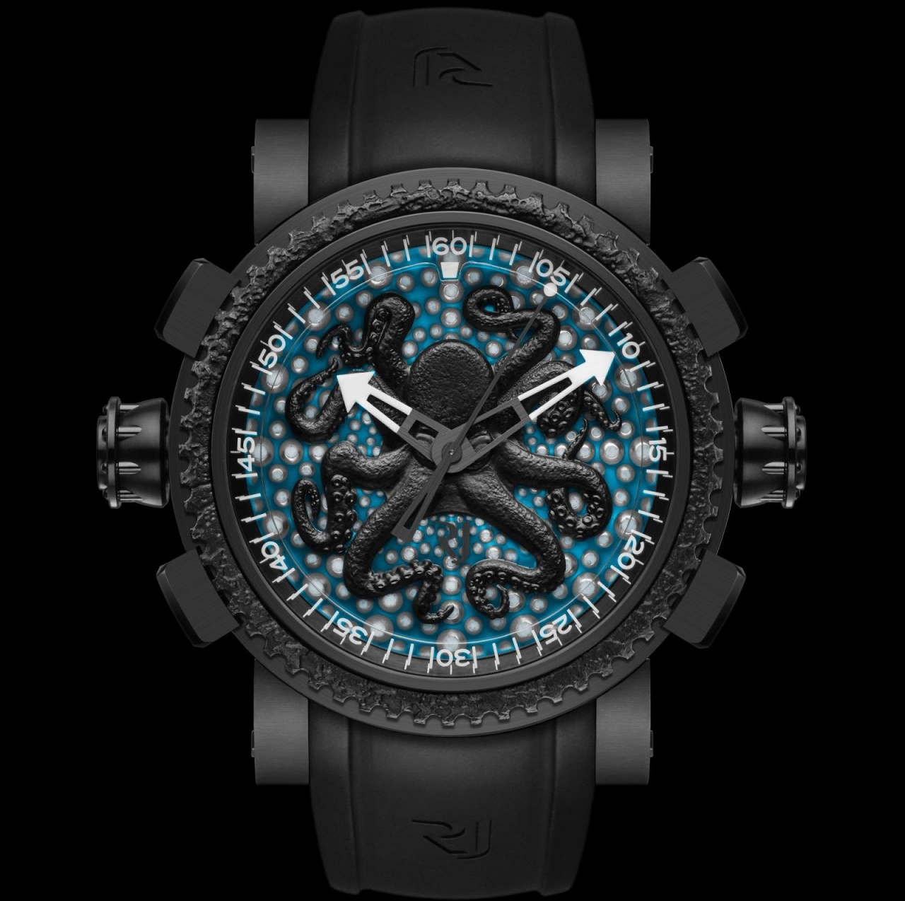 окисленной и стабилизированной сталью (в виде неровно надрезаного кольца) от корпуса легендарного затонувшего лайнера "Титаник". Завинчивающаяся заводная головка расположена на 9 часах, а головка для вращения внутренним вращающимся однонаправленным сапфировым кольцом с минутной разметкой арабскими цифрами, размещенным на периферии циферблата - на 3 часах. На глухой завинчивающейся задней крышке часового корпуса выгравировано изображение осьминога. Сапфировое стекло защищает циферблат выполненный в цвете морского ежа (голубых и белых мелких пятен), с большим накладным изображением осьминога из меди с черным DLC-покрытием. Черные стрелки, в том числе часовая и минутная, покрытые, как и точечные часовые индексы, люминесцентным составом Superluminova белого цвета. Модель оснащена швейцарским автоматическим механизмом RJ 002-A2, на 23 камнях, с балансовой частотой 28800 полуколебаний в час (4 гц), запасом хода 42 часа, функциями индикации часов, минут, секунд (посредством соответствующих центральных стрелок).