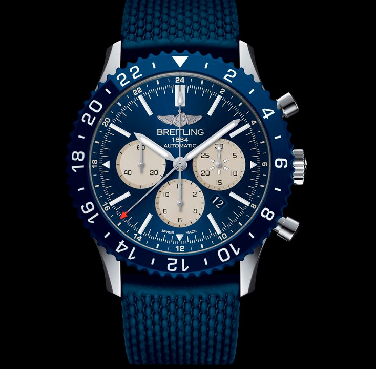 Модель снабжена стальным корпусом, который дополнен безелем из синей керамики и синим циферблатом с серебристыми счетчиками. Под циферблатом установлен сертифицированный COSC автоматический механизм калибра B04, оснащенный удобной системой настройки второго времени. Чтобы выставить на часах время второго часового пояса (местное время), достаточно вытянуть заводную головку и поворачивать ее с шагом в 1 час в любом удобном направлении до нужного значения. Дата при этом корректируется автоматически, а дополнительная часовая стрелка показывает «домашнее» время в удобном для различения дня и ночи 24-часовом формате.