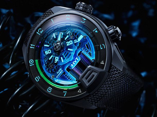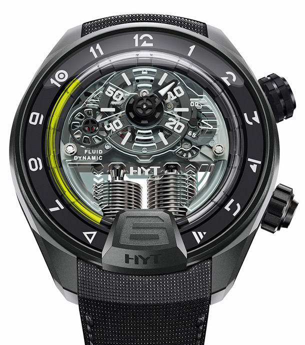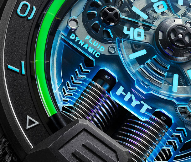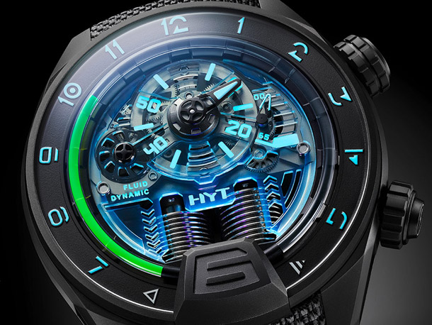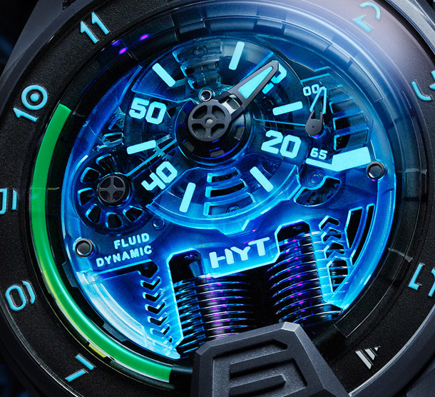 Часы HYT известны своими жидкостными методами индикации времени. Новинка HYT H4 Neo имеет две коронки. Коронка на 2-х часах используется для установки времени. Вторая коронка на 4-х часах используется для генерации энергии. Когда пользователь заводит вторую коронку, заводится вторая пружина, затем эта мощность передается в микрогенератор. Когда коронка закрывается, энергия распределяется на два пурпурных светодиодных индикатора, которые светят высоко люминесцентными «наночастицами» по всему прозрачному циферблату.