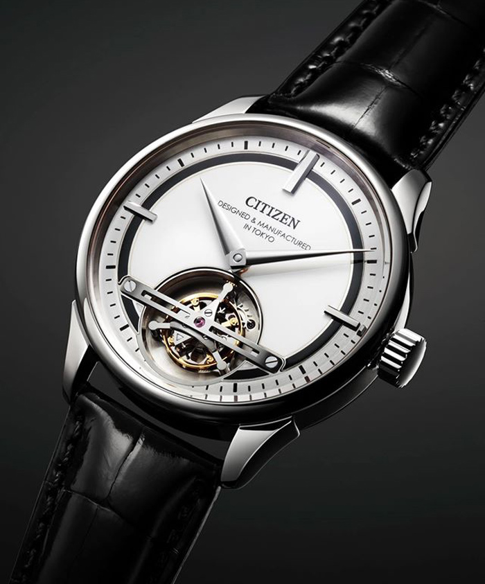 Новинка имеет круглый полированный корпус, изготовленный из 18-каратного белого золота, диаметром 42,0 мм. Рифленая заводная головка расположена на 3 часах. Сапфировое стекло установлено на передней стороне часового корпуса и на его завинчивающейся задней крышке. Многоуровневый циферблат белый эмалевый, с накладными продолговатыми часовыми маркерами, расположенными на 9, 12 и 3 часах, а также с круглой черной разметкой на периферии циферблата. Модель оснащена мануфактурным японским механизмом с ручным заводом Citizen, с функциями индикации часов, минут (посредством соответствующих центральных стрелок), а также с турбийоном, круглая каретка которого размещена в апертуре, расположенной на 6 часах. Калибр отлично отделан.