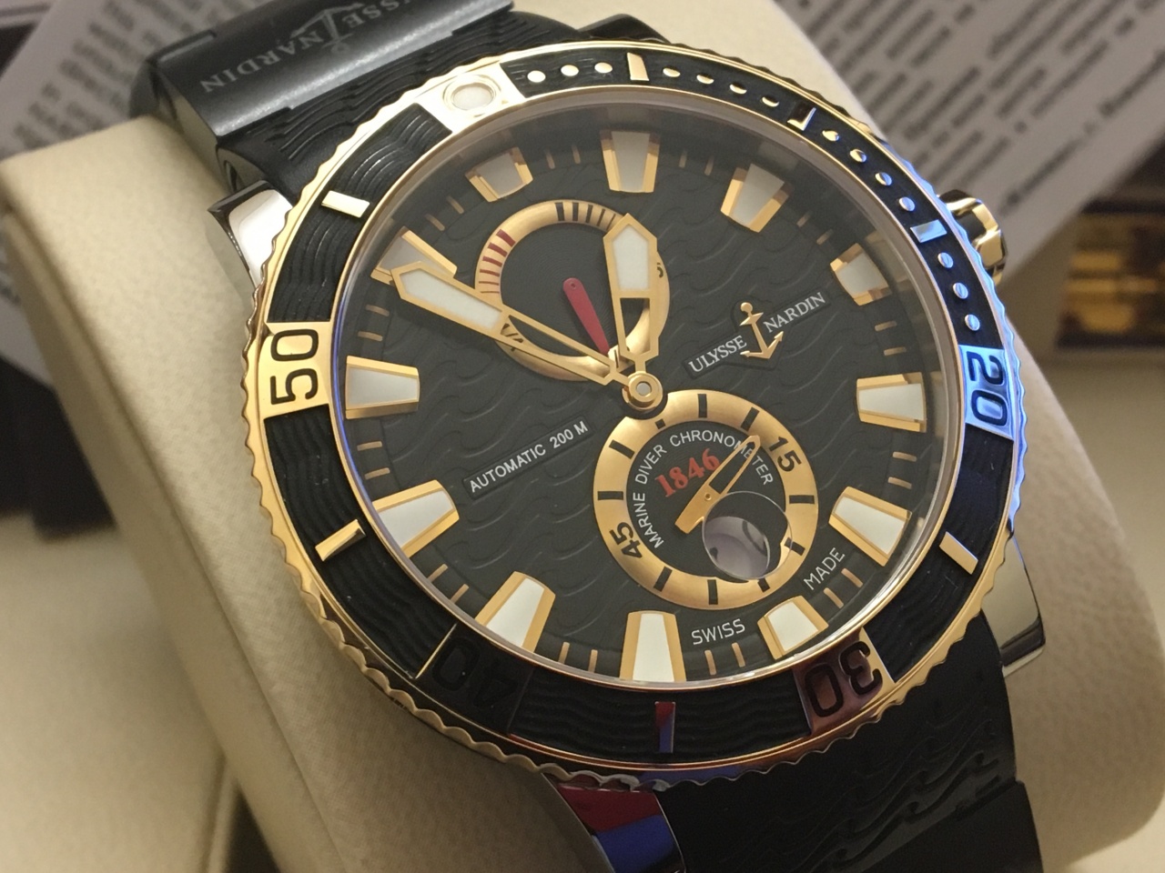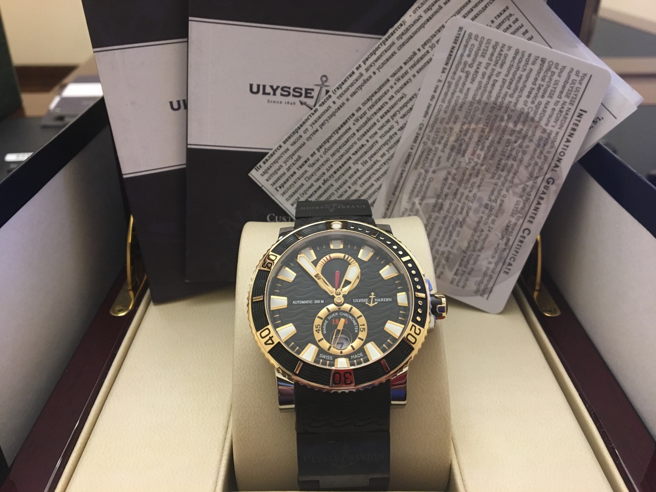 Пол: мужские Год покупки: не указано БУ часы, состояние: AAA (идеальное) http://forum.watch.ru/images/market-question.png Полировка: не указано Цена: 7 000 USD (продажа) Коробка: есть Документы: есть Тип: Часы мужские Материал корпуса: Комбинированный: золото + титан Размер корпуса: 45 мм Форма корпуса: Круглые Стекло: Сапфир Тип калибра: Механика с автоподзаводом Запас хода: 42 час Функции: часы, минуты, секунды, дата, индикатор запаса хода Браслет: Ремешок каучуковый Цвет ремешка: Черный Застёжка: раскладная Водонепроницаемость: 200 м. Цена, рекомендуемая производителем: 14200 USD Присутствует чек на покупку в бутике. Модель выполнена в исполнении 3 материалов корпуса: стали, титана и розового золота 18 карат. Заводная головка так же выполнена из розового золота с каучуковыми вставками для большего удобства при заводе часов. Циферблат с классическими черными волнами, метки и стрелки золотые покрыты люминесцентным составом для лучшей видимости под водой и в темное время суток. Часы с автоподзаводом, калибр UN-26 на 28 камнях, 28800 полуколебаний в час и запасом хода в 42 часа. Окошко даты в положении на 6 часов с маленькой секундной стрелкой. Индикатор запаса хода в положении на 12 часов. Ремешок выполнен из черного каучука с черными керамическими вставками, одна из них с фирменной надписью Ulysse Nardin и раскладной застежкой из титана и стали с PVD покрытием. Вложение 1920331 Вложение 1920332 Вложение 1920333 Вложение 1920334 Вложение 1920335 Вложение 1920336 Вложение 1920337 |