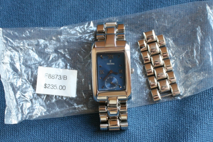 Вызвало подозрение" отсутствие информации о данной модели на сайте производителя, аналог этого года на кож. ремне стоит около 74 евро. Продавец пишет о них: "... Механизм японская miyota какая точно не знаю, не вскрывал пока часы... ", "... Модель старая, приблизительно 2002-2003г, поэтому на оффсайте ее уже нет", "продавалась в стоке, поэтому без коробок и всего прочего Цена ритейла в США видимо на момент продажи, это просто наклейка c задника часов". Просят 800 грн. (89 у.е.) |