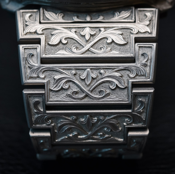 «Настенные часы 18-го века в стиле барокко занимают почетные места в мастерских. Это был один из первых коллекционных образцов, которые дал мне мой отец – внушительное, массивное произведение искусства с изысканной позолотой. Для меня его привлекательность заключается в его экстравагантности, потому что необыкновенные вещи являются для меня особенными», - заявляет часовой мастер Феликс Баумгартнер, соучредитель Urwerk. Воспоминания об этих первых часовых увлечениях, безусловно, вдохновили на создание новой модели UR-210 Amadeus – конечно же, в честь великого Амадея Моцарта. «Вольфганг Амадей Моцарт, безусловно, был пионером панк-субкультуры», - говорит Феликс Баумгартнер. «Надо читать его биографию. Он был мятежником, и Urwerk разделяет этот бунтарский дух». Для ретро-футуристического эксперимента модель UR-210 была внешне преобразована умелыми руками талантливого мастера Флориана Гюллера. Барокко – это краткое описание нового творения. «Внешняя отделка часов проведена в стиле эпохи Возрождения 17-го века, но на современный манер», - комментирует Флориан. «Закрученный узор листьев аканта наиболее подходит для этого стиля, контрастируя с угловым видом часов. Мы объединили корпус, защиту коронки и браслет в один блок, чтобы создать исключительные часы. Мне дали часы, над которыми я работал, и я должен был создать уникальный орнамент на стальном корпусе». Эта кропотливая работа заняла более 260 часов. Обеспечение непрерывности конструкции было главной целью и самой большой трудностью для гравера. «Это работа требует многих аспектов. Узор на деталях должен соединяться и дополнять все части в целом. Это, безусловно, одно из творений, которыми я горжусь», - заключает Флориан. Для Мартина Фрея это столкновение между будущим и прошлым подчеркивает его видение едва различимой границы между временем и пространством. «В Urwerk мы разработали поразительно современное представление о времени, но оно основано на концепции 17-го века. Я рассматриваю это как континуум, а не противоречие, вневременное и универсальное измерение идей и мыслей. С самого начала я всегда задавался вопросом о намеченных периодах времени. Там, где некоторые люди могут видеть ограничения и жесткие классификации, я вижу неосязаемые мосты и связи в бесконечном потоке». Сателлитное усложнение UR-210 с ретроградной минутной стрелкой является очень оригинальным и незабываемым. Главная особенность – высокотехнологичная, крупная трехмерная ретроградная минутная стрелка. Ее функция состоит в том, чтобы сопровождать часовой сателлит и указать время, когда она движется вдоль минутной шкалы от 0 до 60. Это одночасовое путешествие во времени, очерчивающее дугу 120°, является ровным и гладким. Но истинный характер часов раскрывается в конце 59-й минуты. Четкий «щелчок» сигнализирует о возврате минутной стрелки в исходную точку. Менее 0,1 секунды требуется стрелке, чтобы вернуться обратно к доке со спутником следующего часа. Эта высокоскоростная ретроградная система основана на трех ключевых элементах: Центральная ось, установленная в рубиновых подшипниках, обеспечивает отличную устойчивость для сателлитного / ретроградного усложнения. Винтовая пружина цилиндрического морского хронометра движется вертикально вокруг оси и создает оптимальное натяжение, необходимое для ретроградного хо