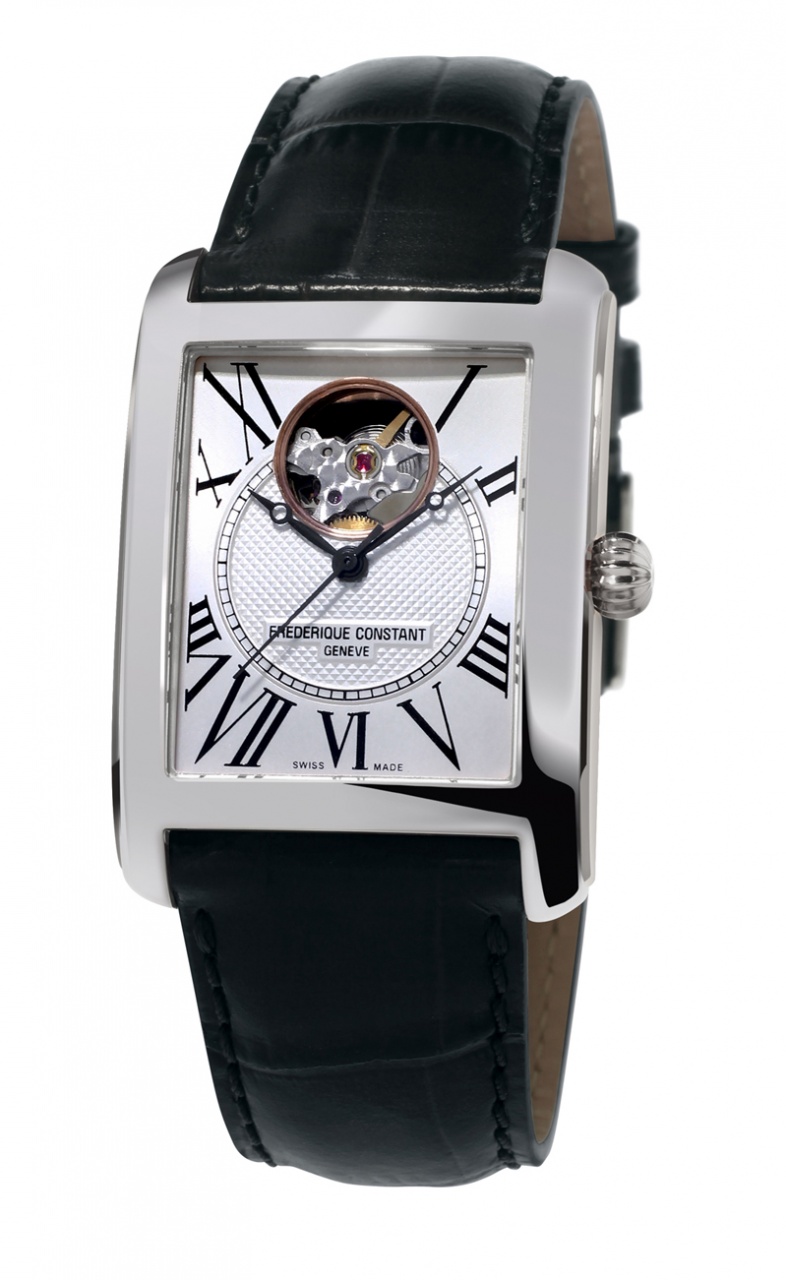 Новая модель Classic Carrée от швейцарской часовой компании Frederique Constant имеет прямоугольный, слегка изогнутый корпус, изготовленный из нержавеющей стали или из нержавеющей стали с PVD-покрытием розовым золотом, длиной 33,3 мм, шириной 30,4 мм, водонепроницаемый до 30 метров. Рифленая заводная головка, выполненная в форме луковицы, расположена на 3 часах. Сапфировое стекло установлено на передней стороне часового корпуса (выпуклое) и на задней крышке. Серебристый циферблат, гильошированный в его центральной части, с напечатанными черными римскими цифрами. Стрелки черные, с "яблоками Бреге" на часовой и минутной стрелках. Круглая апертура, расположенная на 12 часах, позволяет просматривать детали калибра. Модель оснащена швейцарским автоматическим механизмом Frederique Constant FC-310 (базовый калибр Sellita) на 26 камнях, с балансовой частотой 28800 полуколебаний в час (4 гц), 38-часовым запасом хода, функциями индикации часов, минут и секунд (посредством соответствующих центральных стрелок).