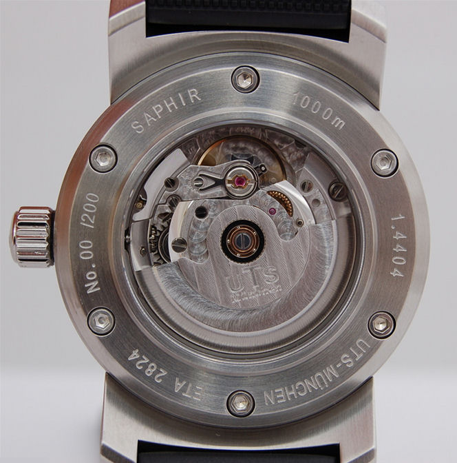 У обеих часов корпуса из нержавеющей стали, диаметром 43 мм и толщиной 14,5 мм, с сапфировым стеклом на задней крышке корпуса. Обе выпущены лимитированным тиражом 200 экземпляров. Модель GMT Professional Diver оснащена автоматическим механизмом ETA 2893-2 в градации "Top", с воронеными винтами, отделанным Geneva wave и perlage, а также персонализированным ротором с выгравированным логотипом бренда UTS. Модель Diver 1000V2 оснащена автоматическим механизмом ETA 2824-2, также, в градации "Top", с персонализированным ротором. Вложение 62317Вложение 62318 Источник: http://www.watchtime.com/2010/08/uts...-diver-1000v2/ |